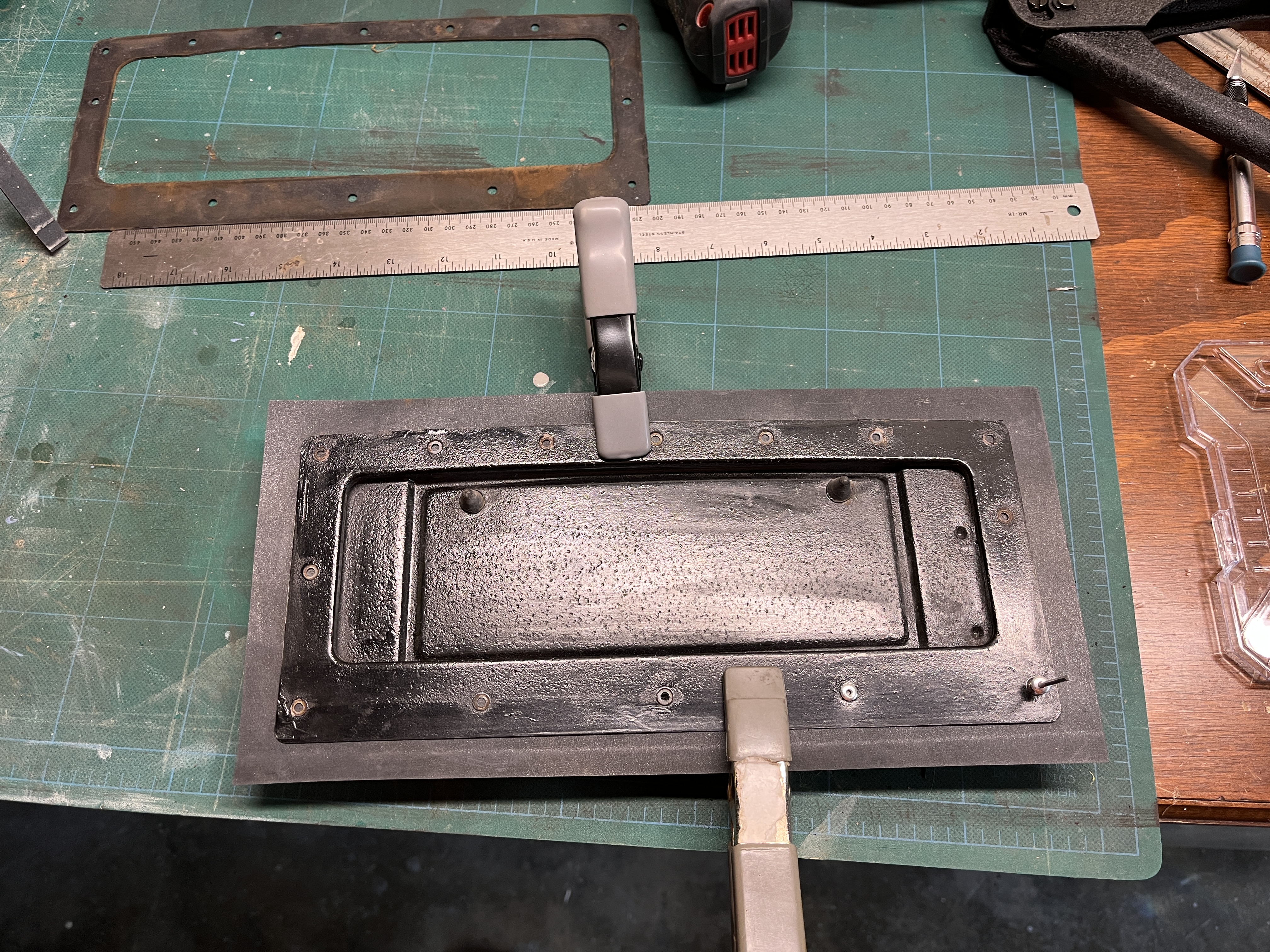 I even painted the inside of the air vent area with rust encapsulating paint before sending it out to the paint shop. I also painted the back side of the cover plate and sealed the inside before assembly. I saw that thread on the samba and another one that gave dimensions for the rubber flap. I made my own from some left over EPDM rubberized roofing I had on hand. The foam inside seemed to be in decent shape so I left that alone. I may regret that decision but we will see.