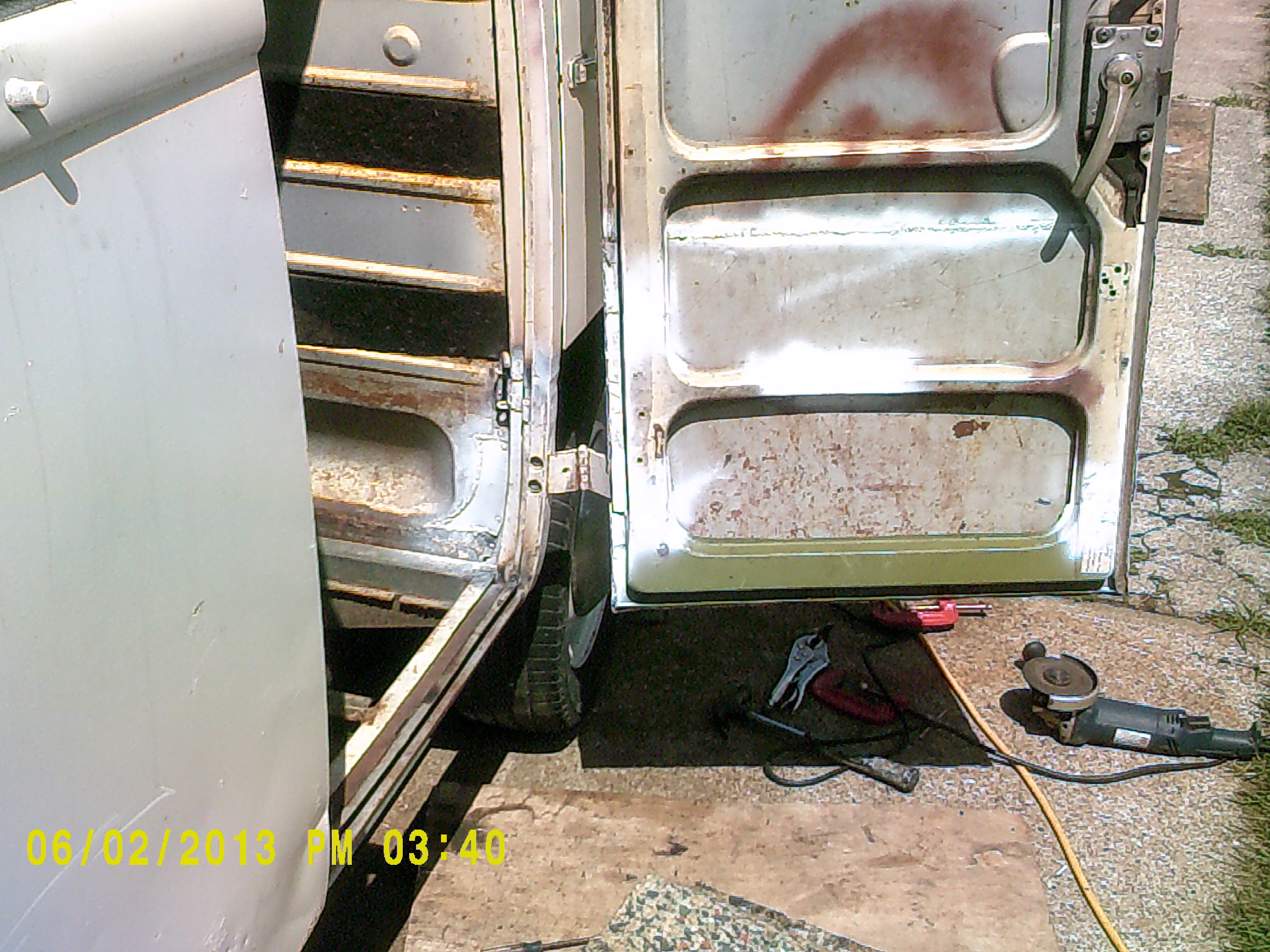 After the rains last night, I decided I should work on getting the door back on, the right side was involved in an accident during some point in the vans life, so the cargo doors are a little wonky. I have tried to get them as best I can, but I think I will ultimately have to replace them. I am going to use them for now, because I have them, but I know toward the end of the build I will not be pleased with them. Aside from the fact that they are not straight, they are heavily pitted from rust and age.