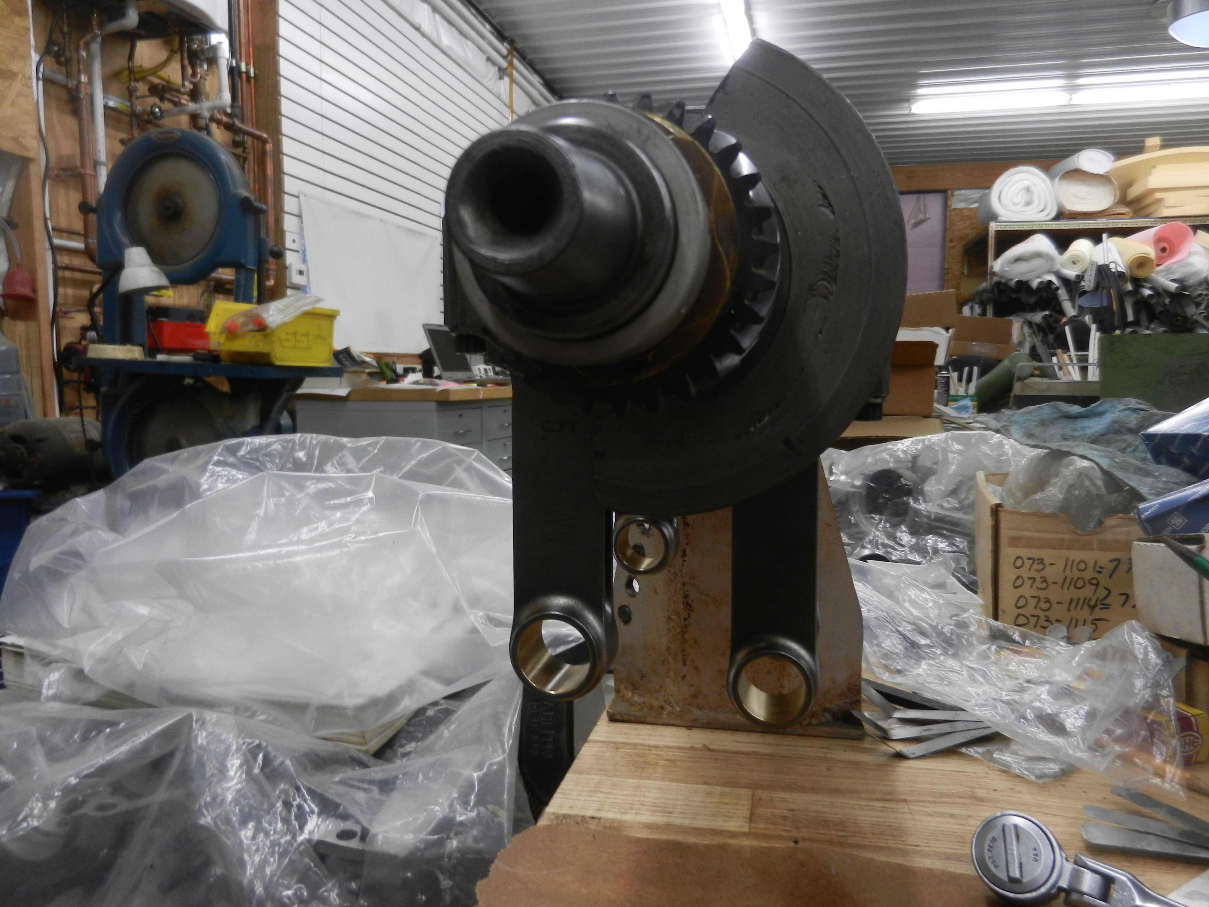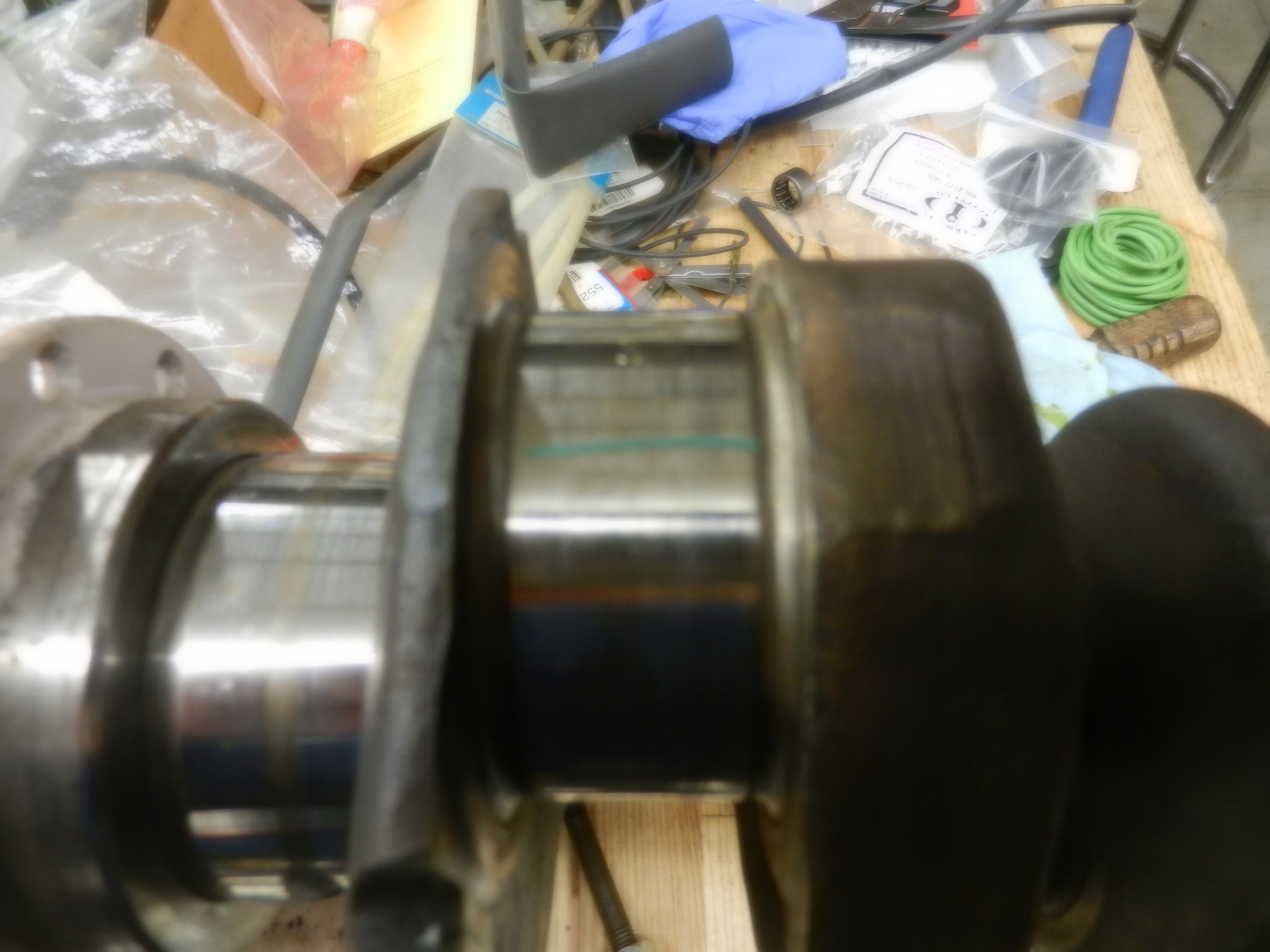 First, install the #2 bearing halves in both case halves. wipe the bearing saddle and the bearing clean.Again. Being sure to align the dowel hole in the bearing with the dowels in the bearing saddle. A little assembly lube on #4 and #1 crank journals, we did #3 when we installed the gears. This is where the marks we put on #1 and #4 bearings come in. install #1 and #4 bearings, again be certain that the dowel holes in the bearing are offset towards the flywheel end of the crank. Holding the crank assembly by the #1 and #2 rods, and trying to keep the crank parallel withe the case, slowly set the assembly in the case bearing saddles. This is where a second set of hands would be really helpful, as we are trying to get the 3 bearings aligned with the dowel holes and dowels, and every thing is moving. A 3rd person would help to take photos