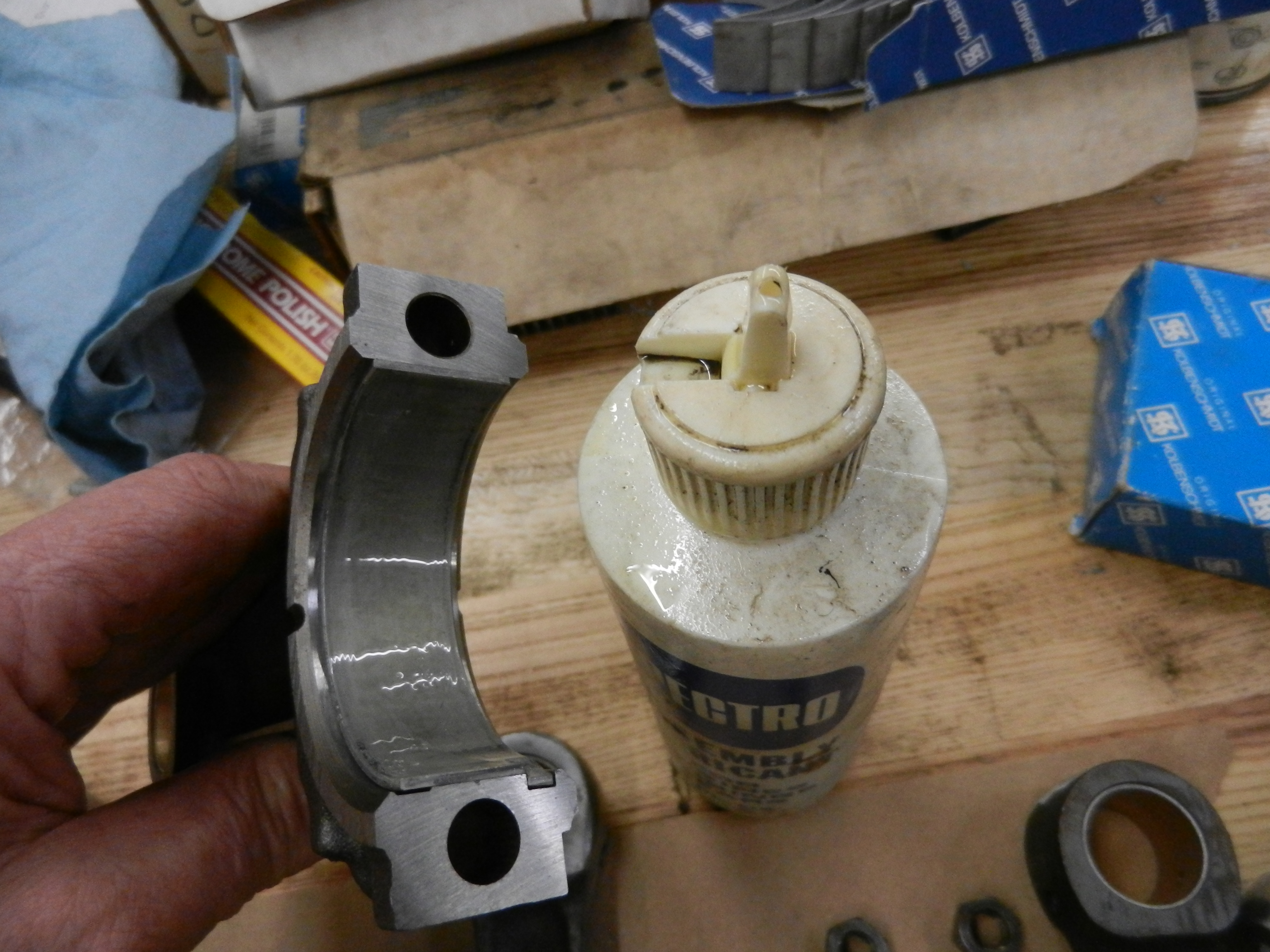 Then lube them up. I have used Spectro assembly lube for years. Squirt some oil into the rod journal and wipe a little white grease on the sides of the rod journal.This helps cushion the side of the rod and get a little oil to the bearing until we get oil pressure when we first crank the motor The AA rods use an arp bolt as opposed to the stock rod cap nut. They require a little grease on the threads. short break, need to take the dog out