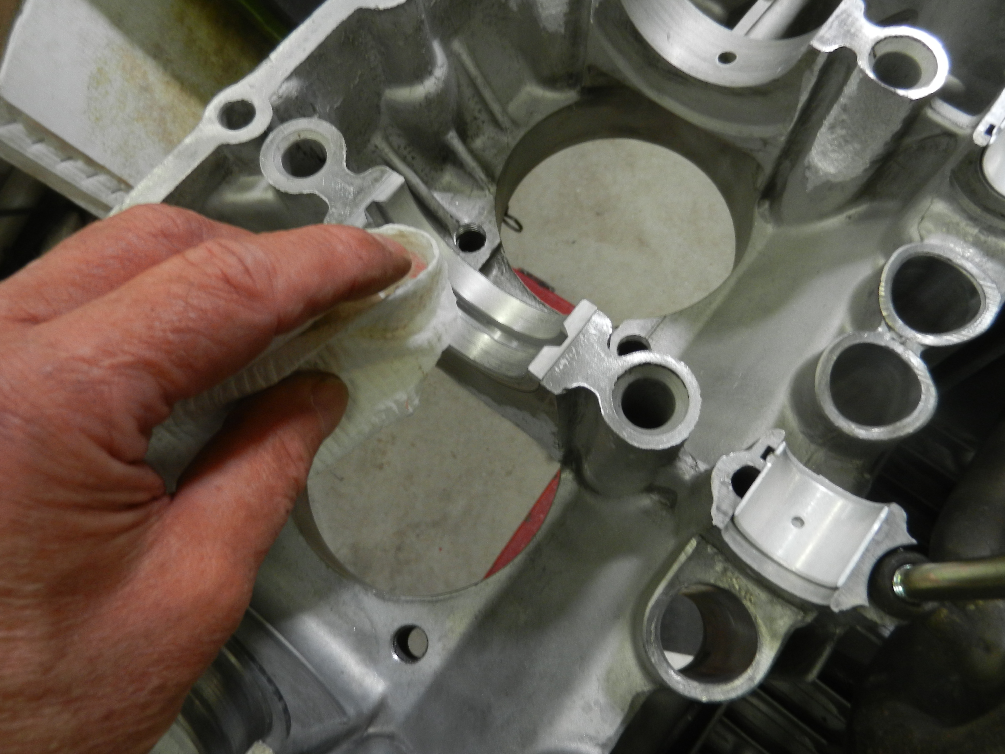 Now, I have to backtrack a bit. Before installing the cam, we install the cam bearings.