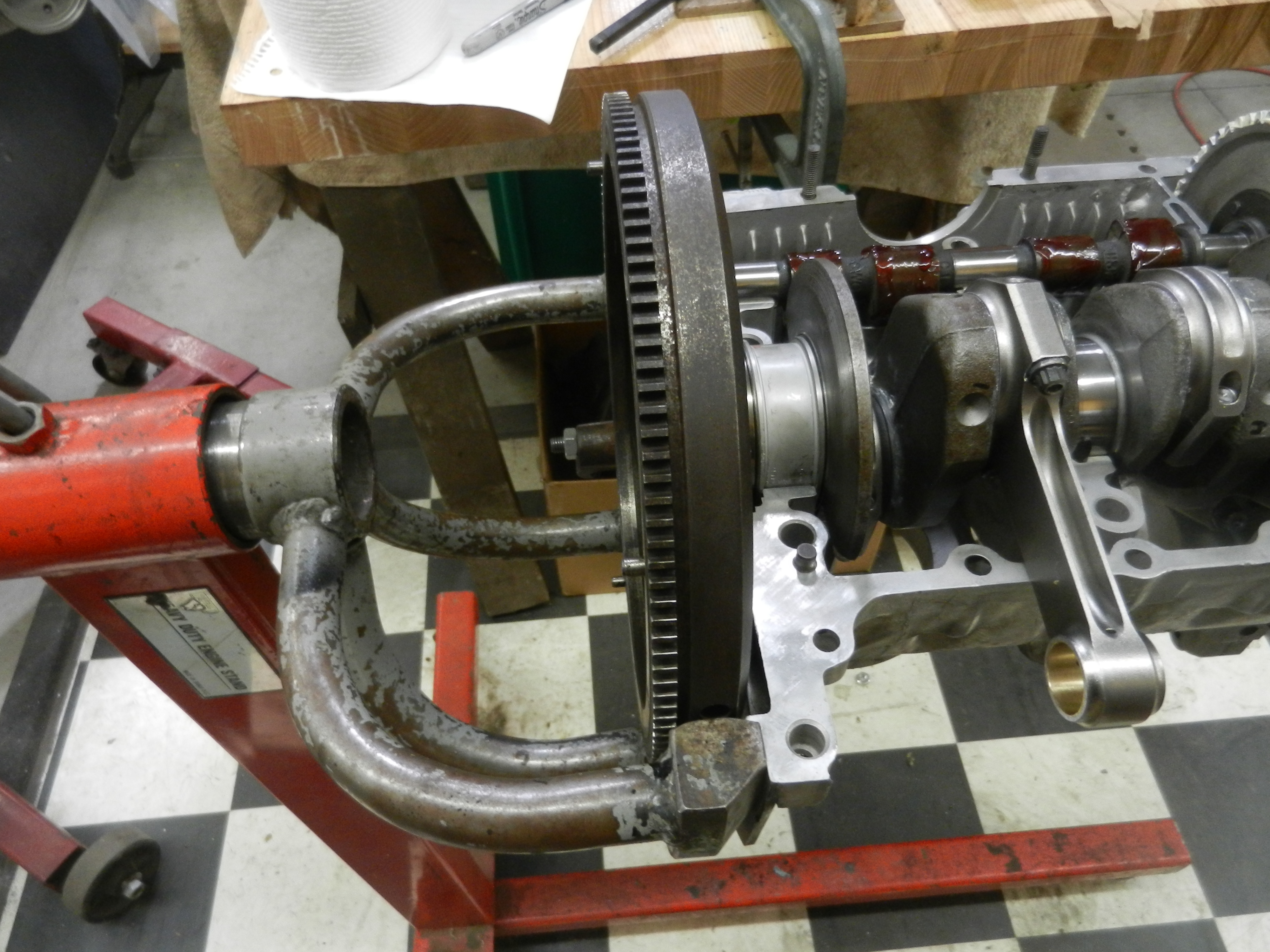 Now is a good time to check the crankshaft end play. Spec. is .003 t0 .005. I like to choose 2 shims (3 are needed). Mic them, write down the thickness, install them and torque the flywheel. Now measure the end play,which will be larger than spec. Do some math and determine the thickness of the 3rd shim needed to get to the desired end play.