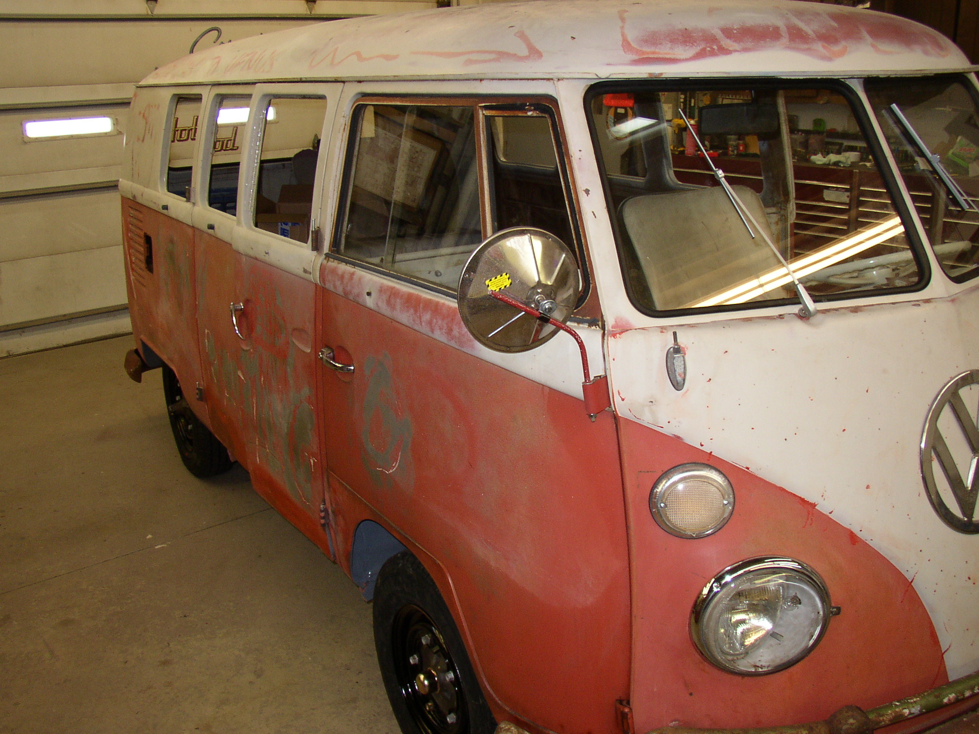 Turn the left tie rod sleeve (the right isn't adjustable unless someone swapped tierods), mine took some heat to free up. I started with about 1/2" of toe-in. Camber and caster are non adjustable on older VW's. If you don't have turntables you have to roll the bus back and forth each time to settle the suspension. Once the toe is set, drop the drag link and turn it to level your steering wheel. I have about 100 miles on it now, it really drives much better than I expected- motor, trans, suspension are all great, I put 10w30 oil in it for the winter. Not as much rattling as I expected from the doors, either.