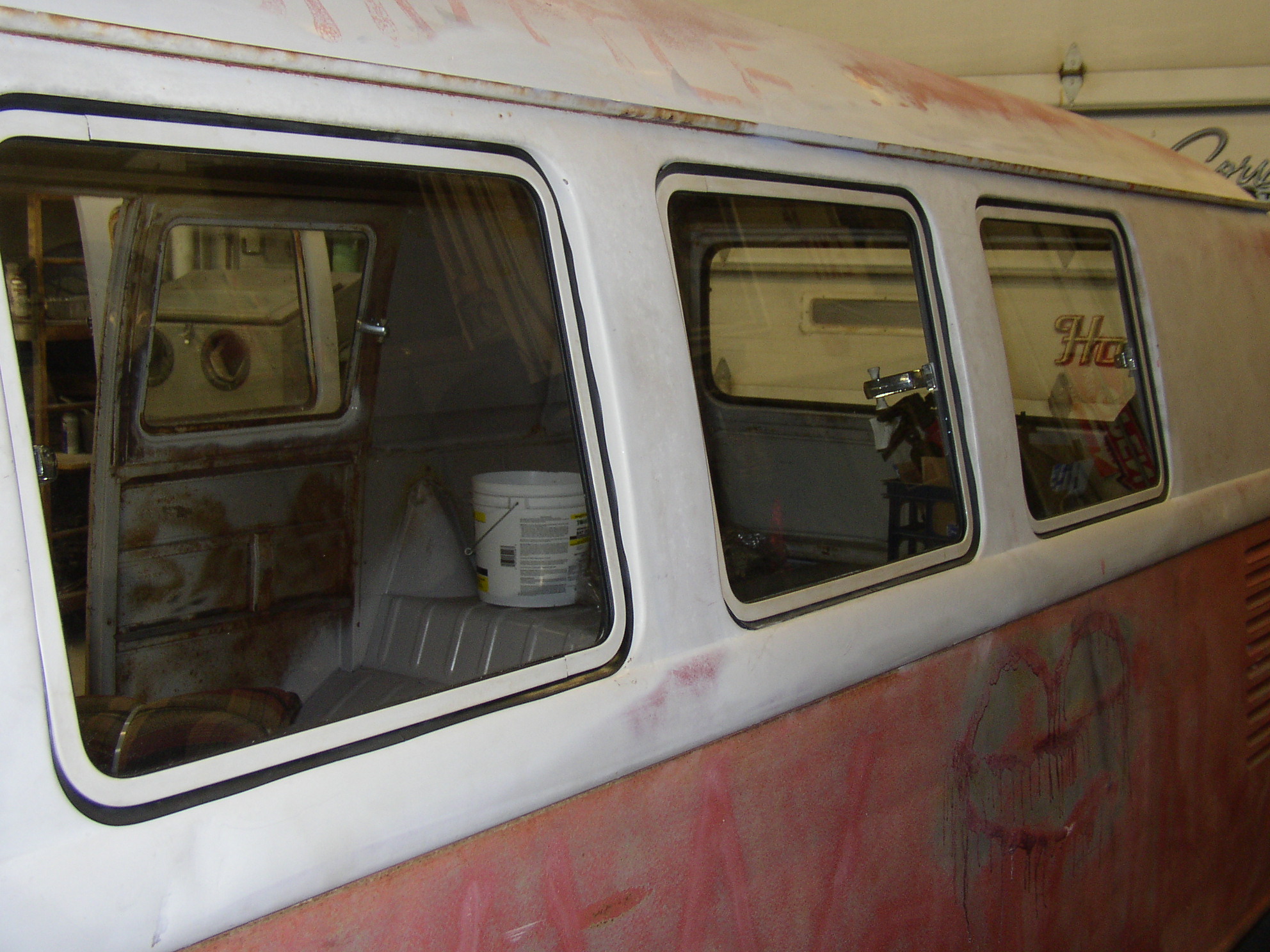 Install, buff the latches, use baby powder for a lube, dry rubbers fold up when you open/close the glass. Install the third seal on the window opening in the bus. Repeat 6 times.