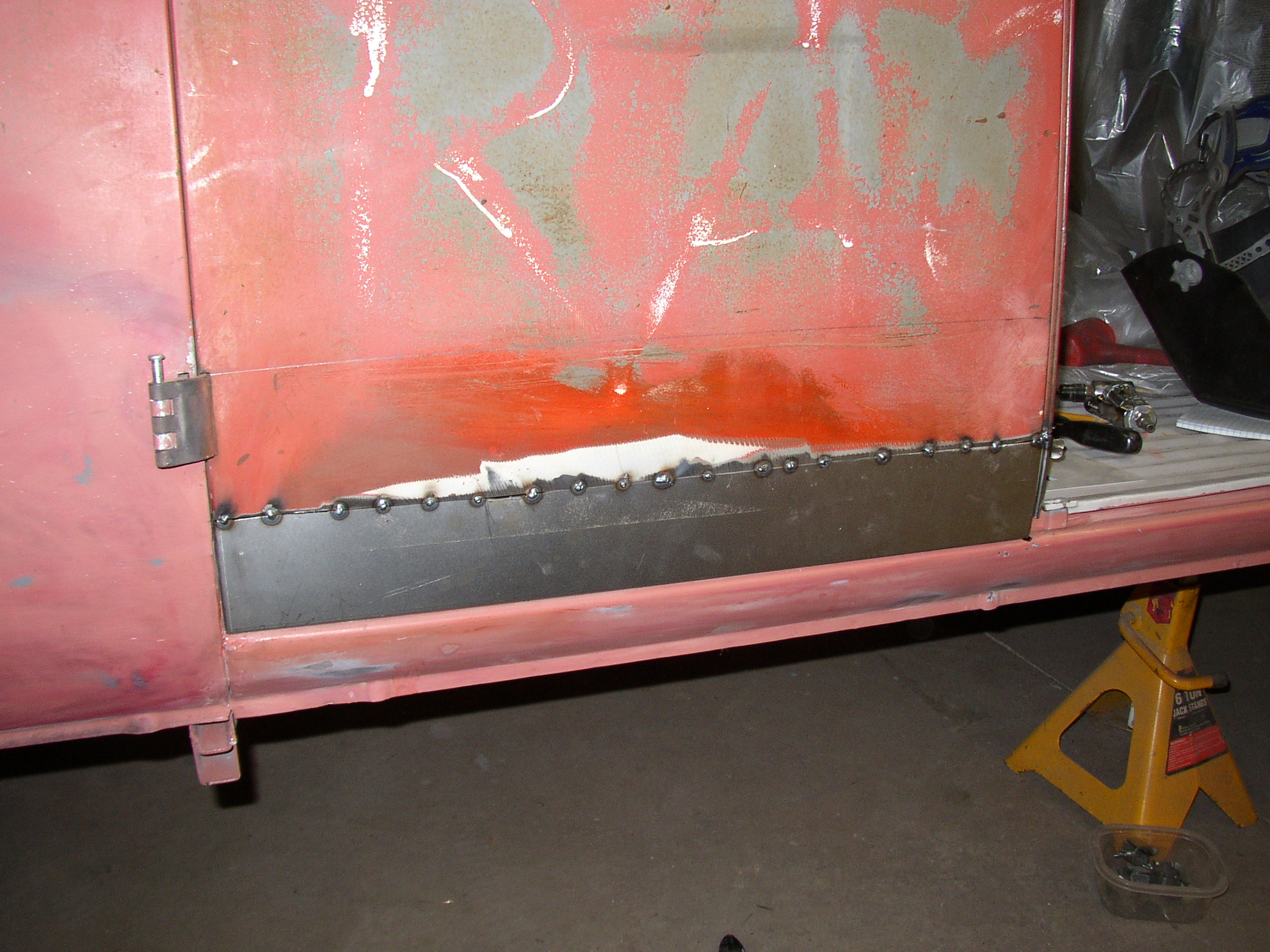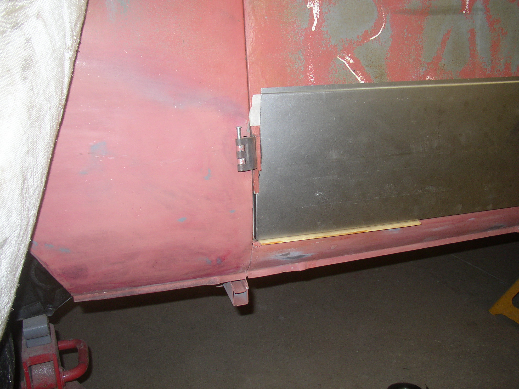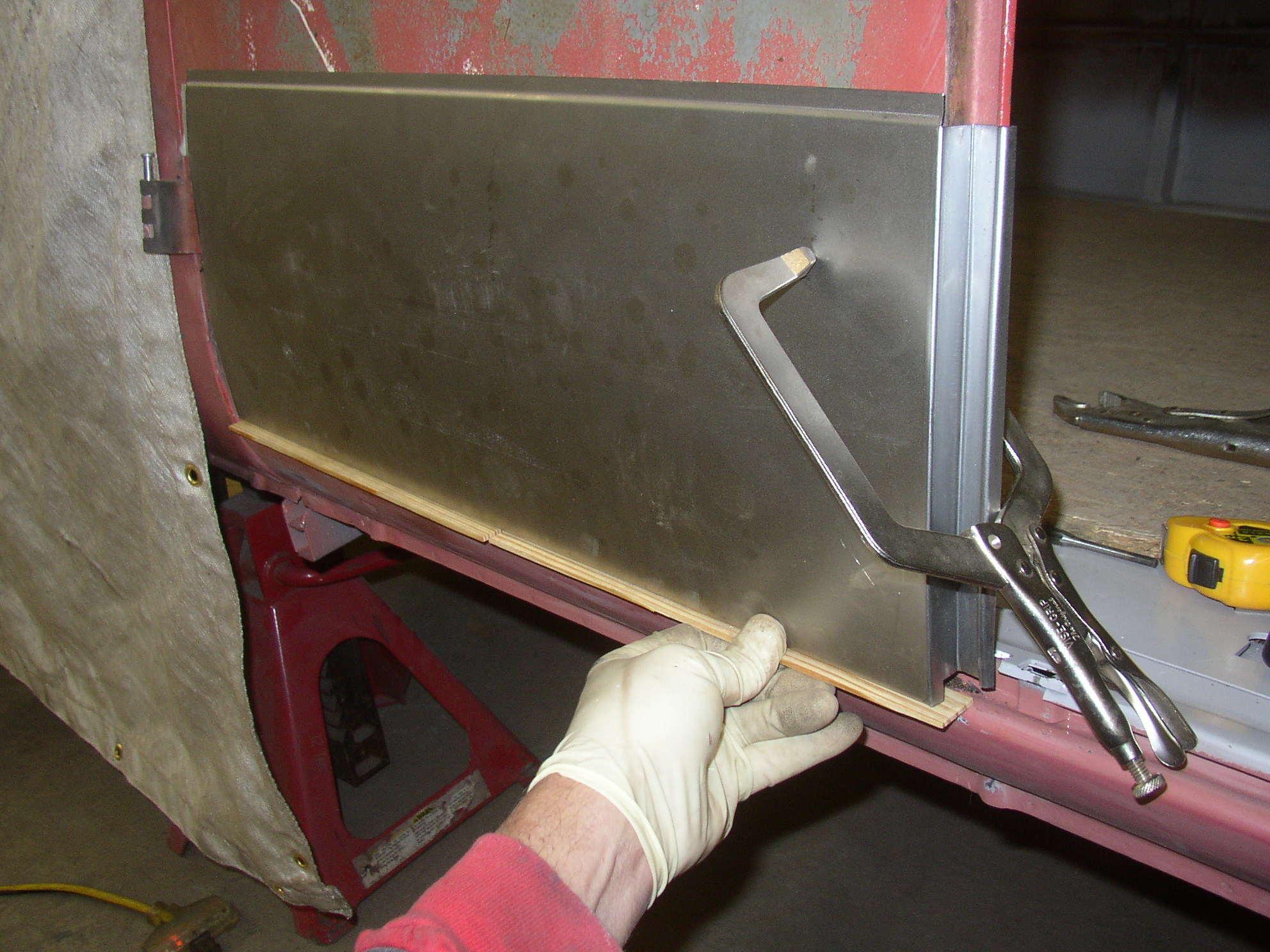 Put the door back on and size things up. Set the new outer panel in place and cut the upper stuff away by the hinge that gets in the way so it will sit almost flush.