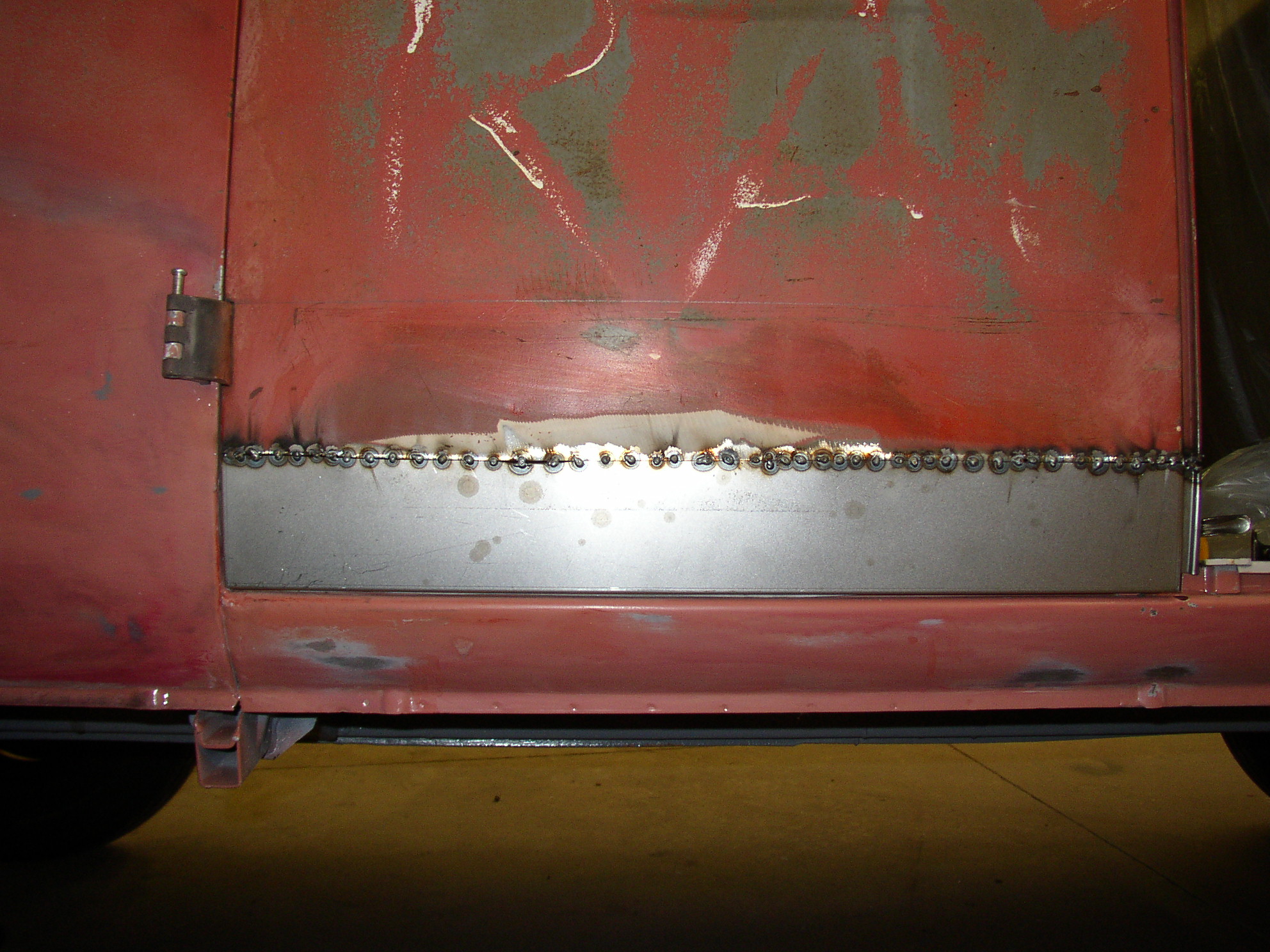 Start welding, but don't get in a hurry. If you don't cool each tiny tack weld completely down to room temp, the panel will warp like a potato chip. Here I'm welding- 2 seconds welding a tack, 5 seconds with an air gun cooling it off to room temp. Repeat 500 times. Keep moving around and take your time. Fill inbetween each tack until the tacks grow together to a solid weld. Note the gaps look nice. That's a fiberglass welding blanket hanging behind. This was about 3 hours taking my time, a pro could probably do it in half that time. Maybe you don't even need to pull the door, you might be able to do it all with the door hanging in place. At this point I'm still not done welding the outer skin and still have to fit and install the inner support. I know that's going to give me grief from the last time.