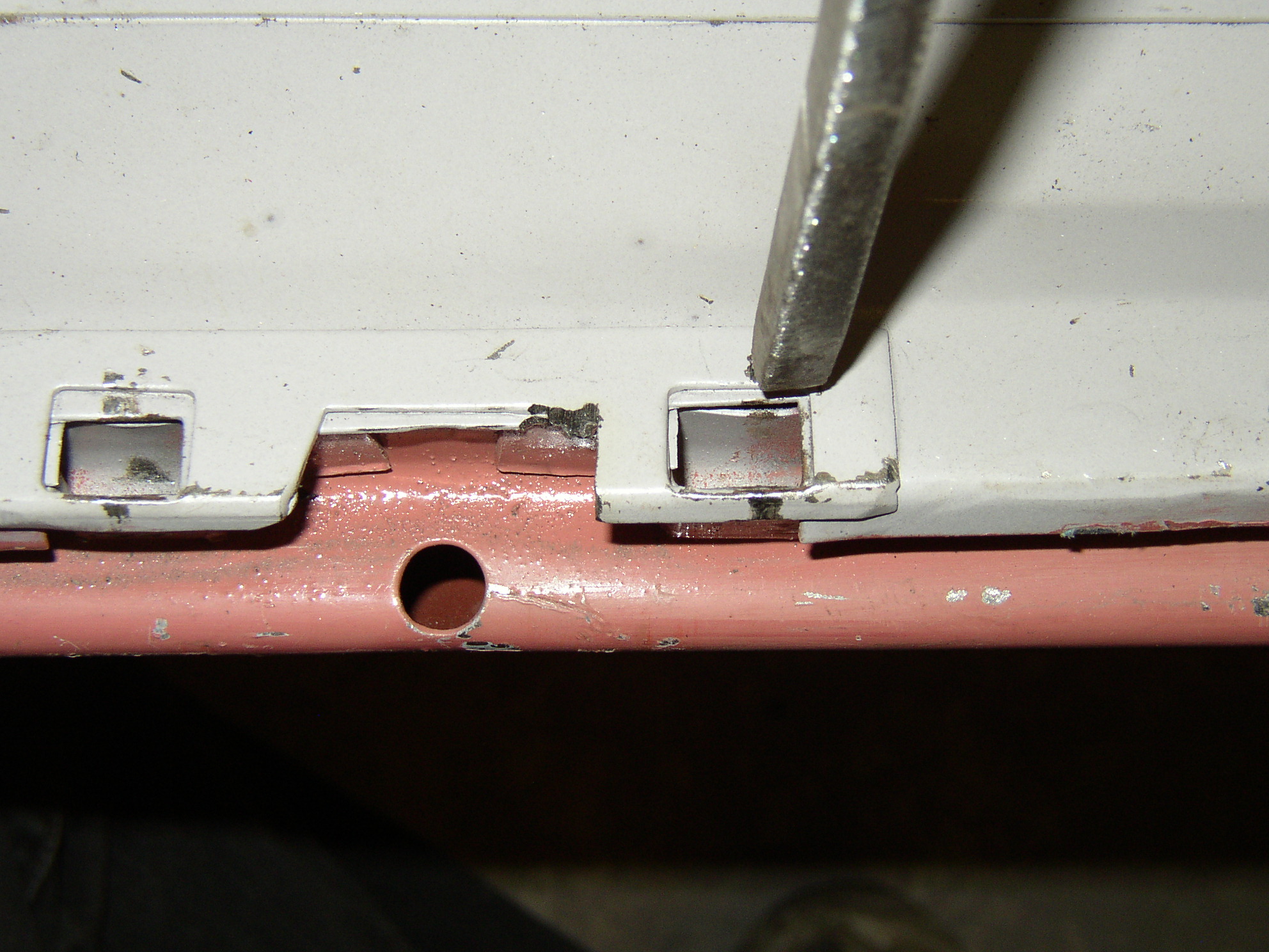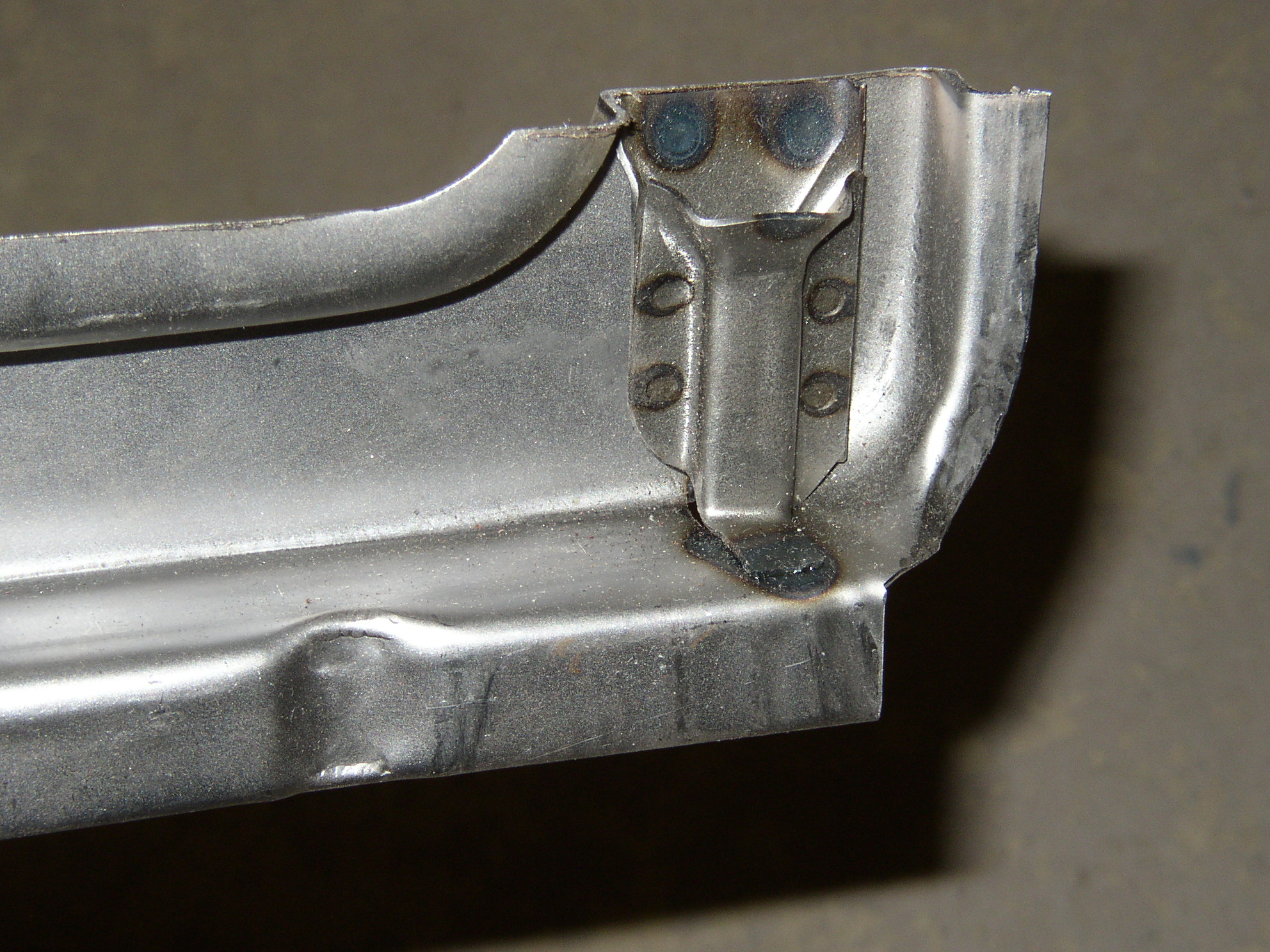 So drill the spot welds partially through to weaken them, then pop them apart with a screwdriver. Here's the bottom, compare it with the rotted OEG- not that much different. Open up the hole with a square file to bring the lock rod about 3/8" outboard. Test fit it. Clamp the guide back in using a hex nut as a spacer. Weld it in place, Drill some holes for plug welds, someday I'll buy a spot welder instead of borrowing Chuck's. It's not going to see daylight inside for a long time so shoot it with some weld-through primer.