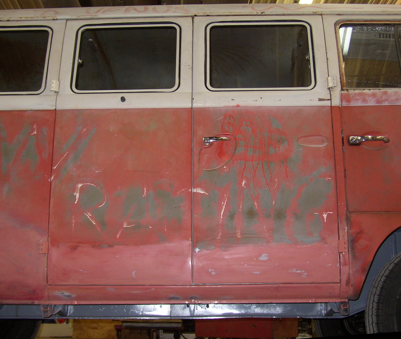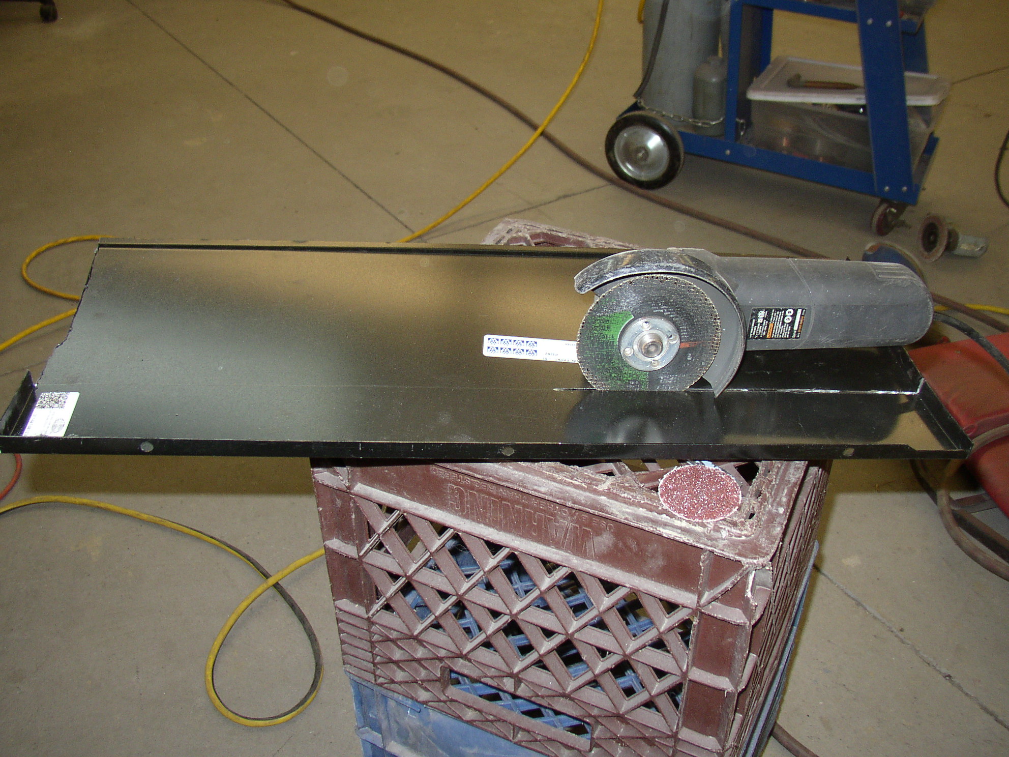 I figured it would be easier off the bus so I popped the pins and worked on a cart. More mud, then 36 grit on an air file.
