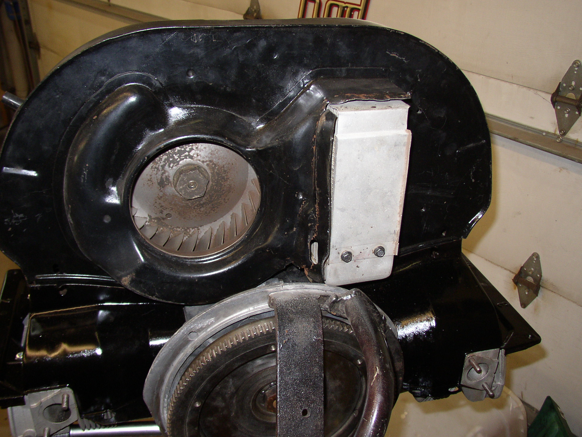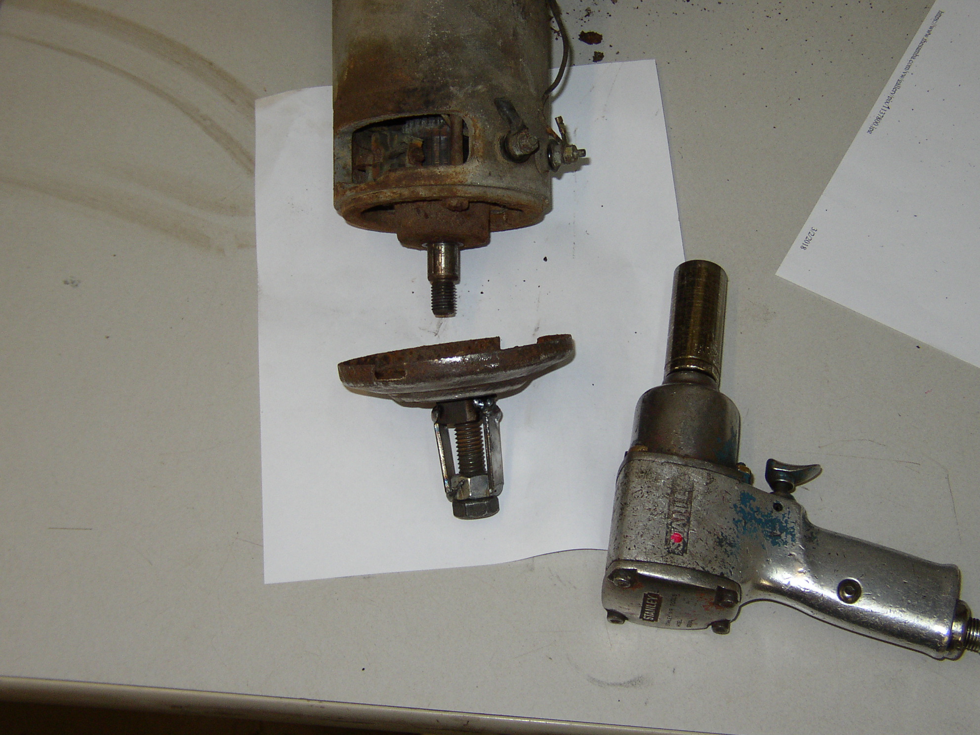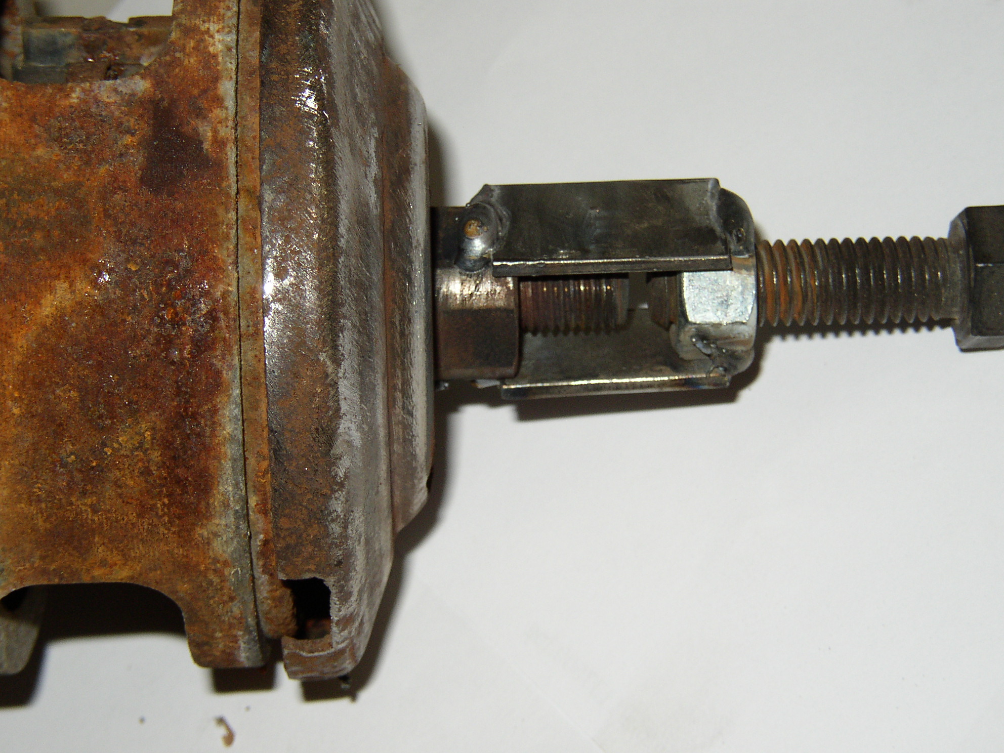 By all outside indicators, this looks like a really nice virgin low mileage engine. Throttle shaft is tight in the carb, almost all original components, nice end play and no vertical movement in the flywheel. Good compression (135-145) across all 4, runs good with no noises and starts right up. I have high hopes for this as a spare engine. I bought it at a garage sale from a widow whose husband was going to build a kit car but died first. I'm thinking I got lucky on this one. Fan hub was broken, no big deal. '74 AH case. Strip it down to retrim it to a generator setup and make sure the fins are clean. Cut the EGR flange off the intake manifold. Run a 3/8" tap into the hole, bottom a 3/8" bolt into it, cut it flush with a whizzer and grind it smooth. I don't know how you guys get stuck gen pulleys off but here's how I do it- weld a homemade puller onto the pulley and burp it loose. You can cut the puller from the pulley and re-use it with a bit of grinding, that surface is not used when in operation. Here's something bizarre when it was on the run stand- the bellhousing adapter is bolted tight but not grounded! Ted would call this a voltage drop of 12v when it should be under .1v