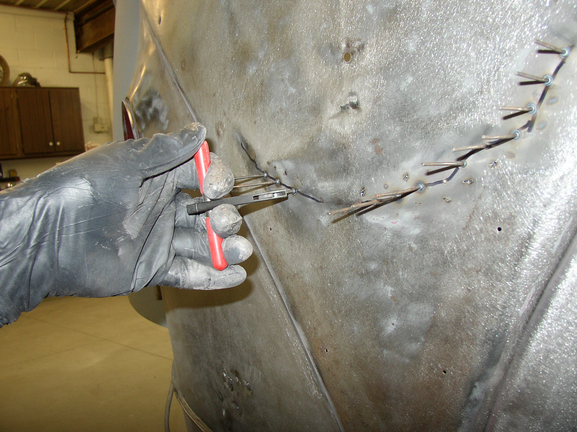 Chuck helped sling more mud, but it wouldn't show up in pictures anyway. The cool thing I bought was a pair of Shrinking Discs which were recommended to me by several people, I've only used the big one, but very happy with what it does. After working out a dent, you invariably have a high spot or bump from the metal being stretched. The shrinking disc heats the bump using friction, similar to what a torch would do. After heating the bump, cool it with water or shop air, and the bump levels out. Quite impressive! Once again, pics wouldn't show this as we’re only talking about 1/16” or maybe 1/8” max here. It flattened out several high spots for us but did not work on one that is on a weld line- evidently the high spot has to be in regular sheetmetal, but for those it’s great!