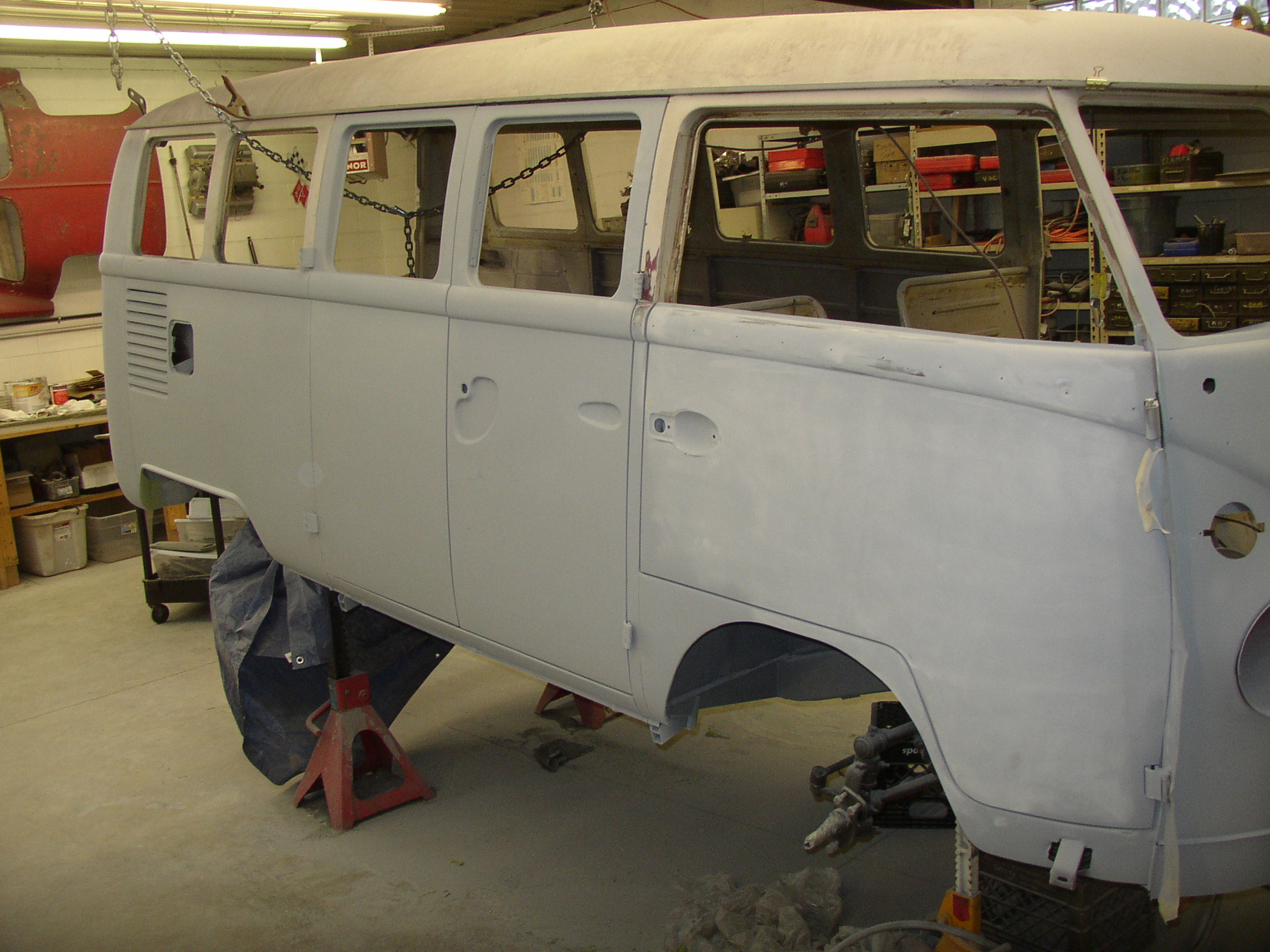 I removed the Bondo from the dent in the middle and worked it out from the inside, it came out quite well and will only need a skim coat instead of the 3/4" it had. I stripped the paint to find many coats, this was a '67 Deluxe door- it looks like the original bus was yellow bottom, white top, and repainted blue, but there's no factory yellow color in splitties, so I guess it changed color at least twice in its life. There might be 7 layers if you count primer- 2 blues, yellow, and white.