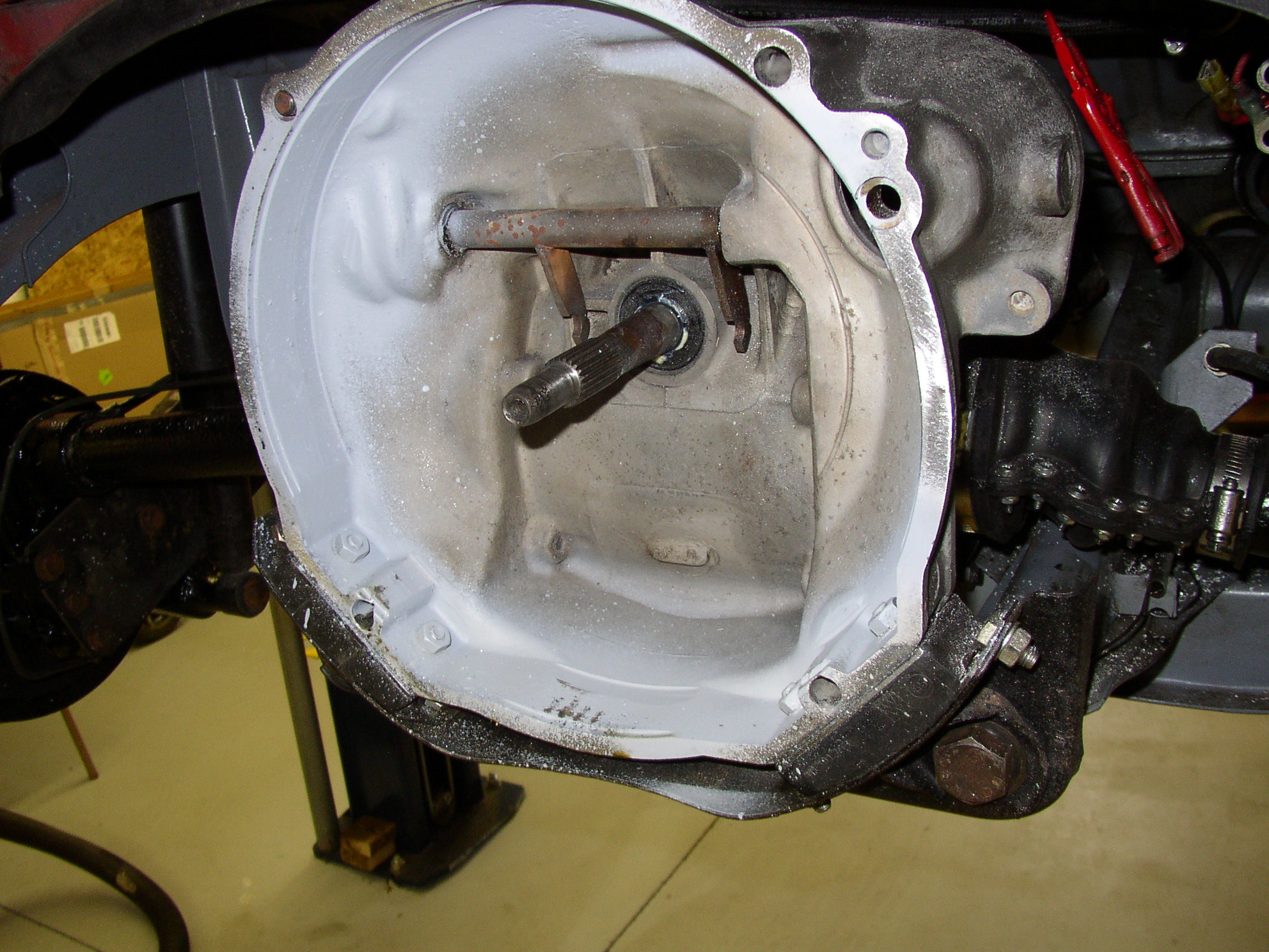 Time for something to laugh at. The trans I had built was an early 60's 6v, probably a small nut, and I put big nut axles on it but my 12v flywheel won't fit in a 6v bell. You know what comes next, the Hillbilly Bridgeport.