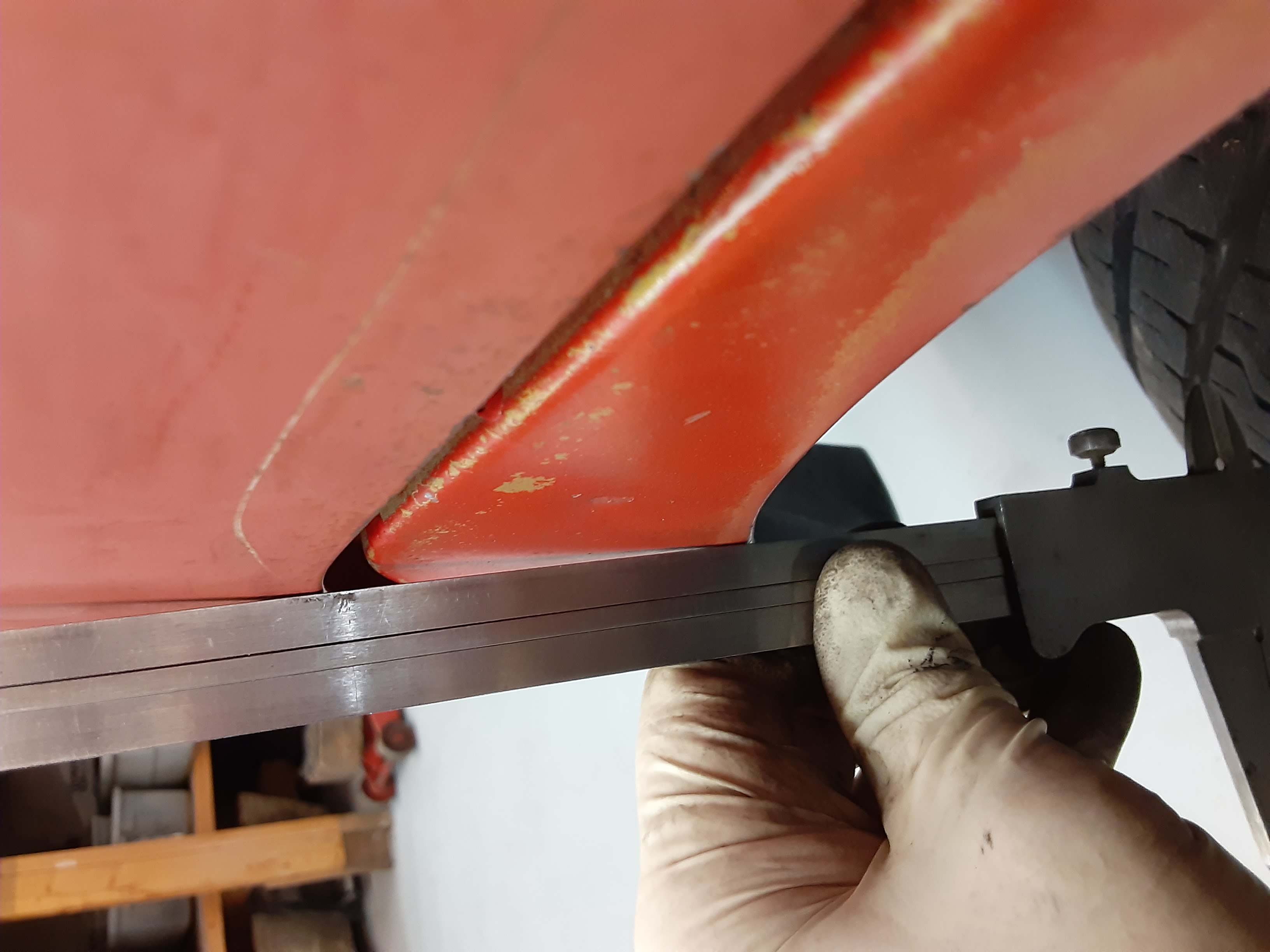 It had a big twist to it. This is closed- the top is inward about 1/4" and the bottom is outside where it should be by at least 1/2". I'm thinking 5/8"-3/4" twist, at least. Wicked air leaks and wind noise, of course. And the center is bowed out 3/8" Even though the front hinge area is kicked in over 1/4". Man, this is one messed up door. I knew this all along but didn't want to take the time when originally building the bus. I knew it would be a large investment of time to make this right. Strip the door and window frame and set up a hillbilly jig to straighten the twist out. It took some serious grunt! Muscle and prybars would not touch it without extra effort. The threaded rod is anchored to a nut bolted to the seat belt mount. Glow the hinges several times to get the angle right. Pull the door and flatten it with a giant c-clamp to get the bow out. I flattened it by over 1/2" here. Heated the window frame to make it fit also, and replaced the weatherstrips for the slider. Put some brake lines in the strips while the glue dried to make sure they dried straight. When done, it fits and closes perfect. No air leaks or wind noise. The gap at the bottom seems a bit large which makes me think it's not from this bus. If I lower it to make that gap right, the beltline is mismatched considerably. I don't want to tell you how many hours I have into this but it's way more than it looks...…...