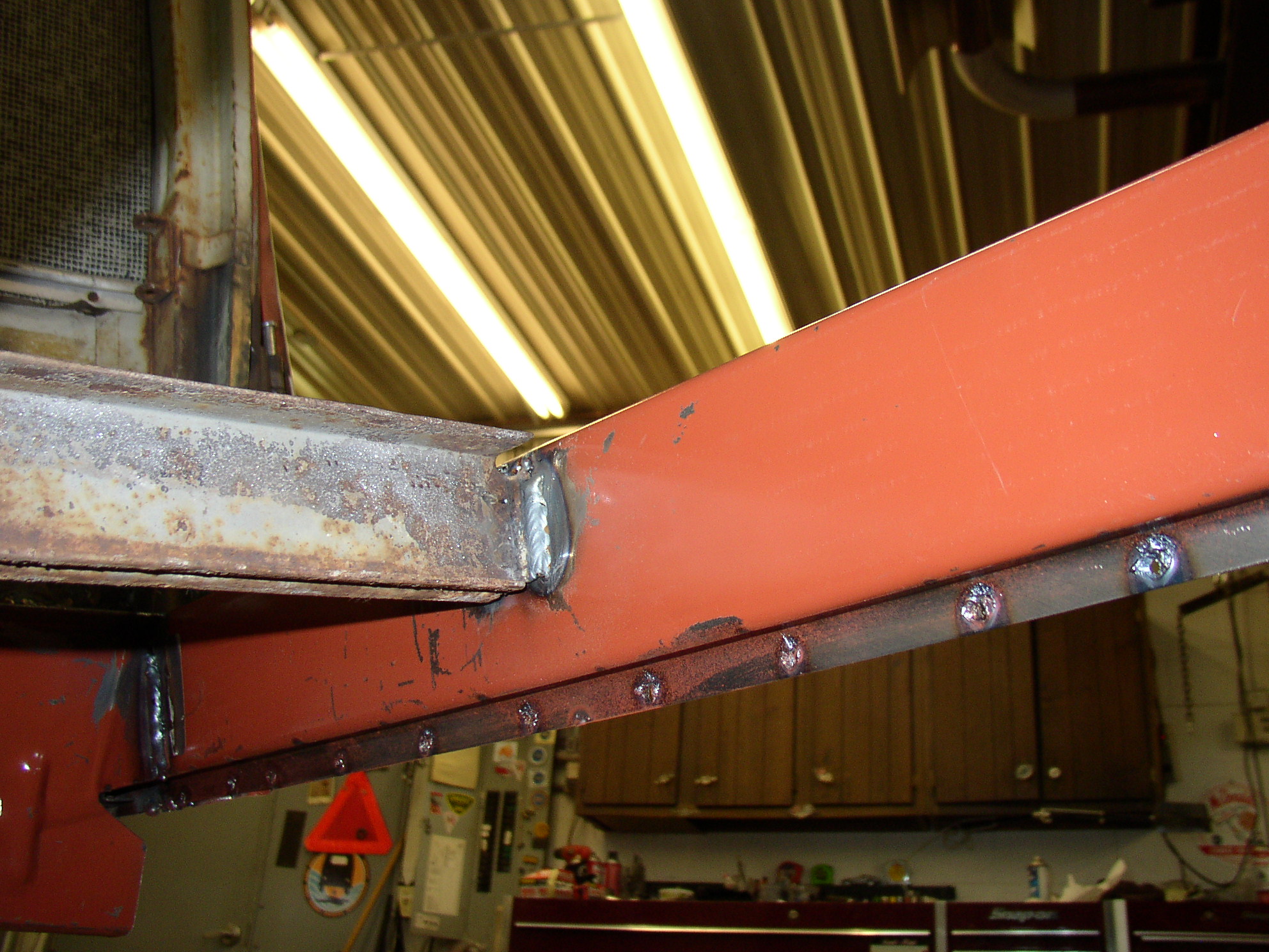 Front of bulkhead/outrigger/jack point from front wheelwell. Ugly welds but strong.