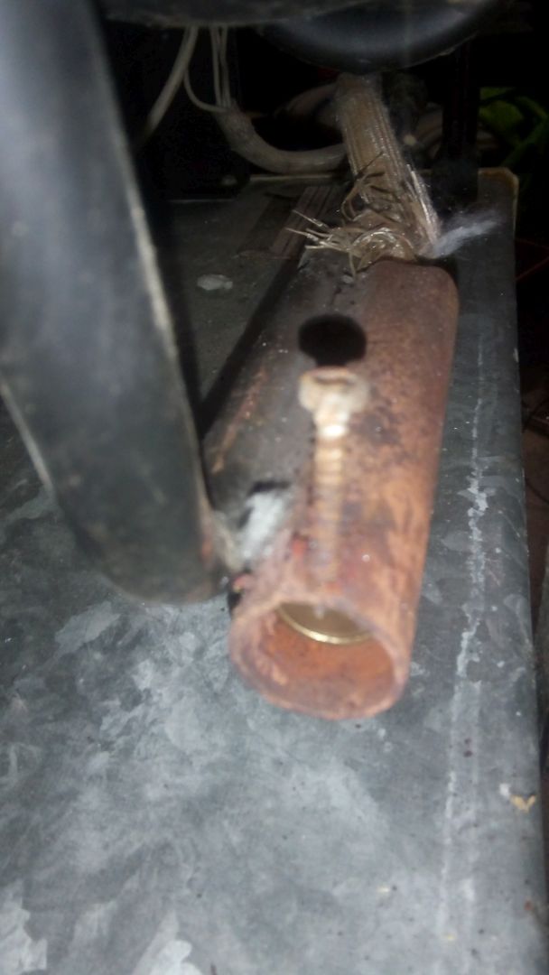 The yellow wire nuts and the electrical tape on the insulation mean that a PO messed with the unit. Removal of the bottom insulation reveals the heating element, hidden inside a tube welded to the coolant line you can see the tip of it inside the tube; admire the ghetto clamping screw! The heating element slides out easily; the first problem is that there are four wires coming out of it, instead of two Notice the stamping for both 12v and 115v, which means that it belonged to a canadian model - with separate circuits for battery and shore power. Next I removed the fabric insulation to expose the entire length of the wires, so I can separate the 12v pair from the 112v pair. I assumed that the 12v pair was the one initially hooked to the blue and black wires on the socket; I actually lucked out on it.Testing is easy - just hook up the wire pair to the battery terminal - I don't think polarity matters the element started immediately, and was piping hot within 20 seconds So the heating element is good!