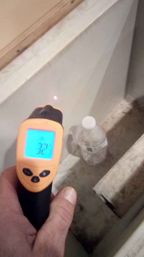 all hooked up to power! nothing blew! temperature at start of test temperature after 20 minutes right about now I had an epiphany and realized that I might burn my basement down, so I quickly unplugged the fridge.