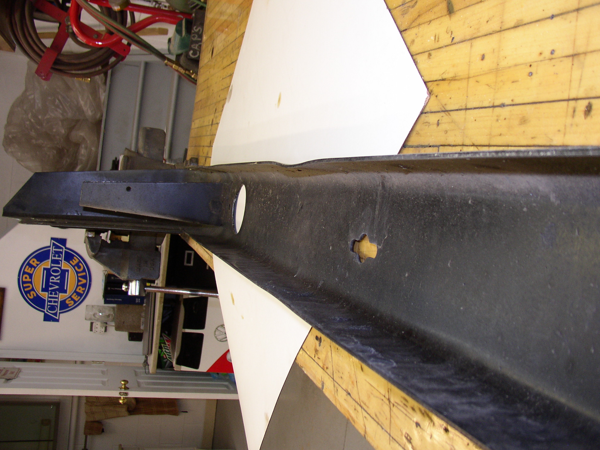 The PO painted the car but did a shitty job on the bumpers. Between that and damage from shipping they needed to be removed, straightened and painted. The damage was weird- not impact damage but "pulling" damage from either being dragged around the bodyshop/museum or loaded onto the car carrier with a strap. Anyway I straightened them as good as could be. I still have giant C-clamps from my truck days, those aren't Chinese cheapies but forged-in-USA clamps. I bet they're $200 each these days or more. I used a piece of 6" I beam for a jig.