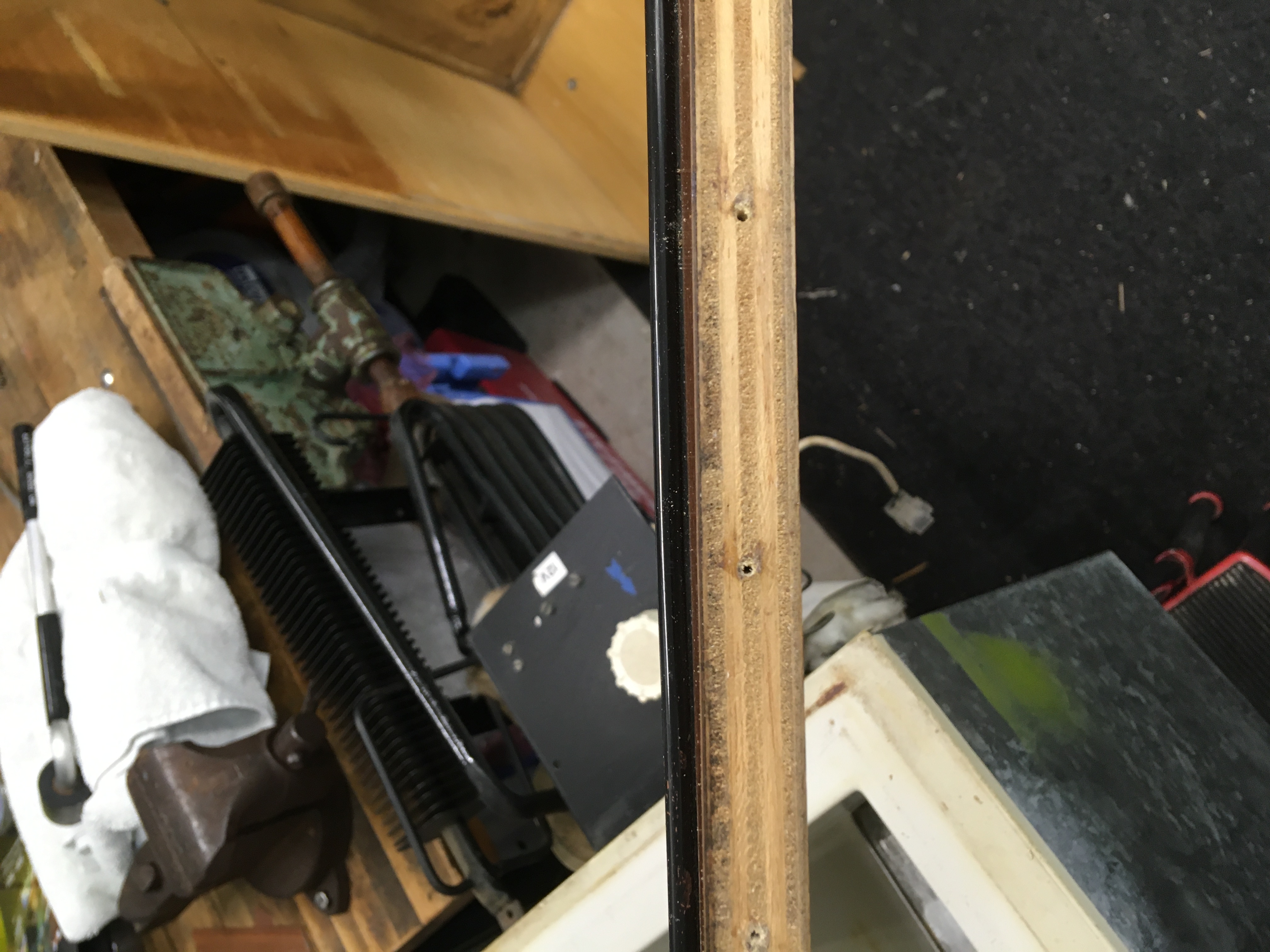 Today I worked on the refrigerator cabinet. It had a bit of water damage from the vent window that had been leaking. There was a piece of laminate missing on one end and a layer of the plywood underneath. I mixed some epoxy wood filler to level out the missing plywood layer and the will glue in a new piece of laminate. The bottom of the cabinet had begun to delaminate so I glued that back together and then used some epoxy filler for the gaps. The rail that the refrigerator lid and storage compartment lid attached to had loose holes were the hinge attached. I used some gorilla glue and toothpicks to fill the holes and the drilled new smaller holes My son and I cleaned and polished the galvanized sides of the fridge. Tomorrow I plan to sand and varnish the bottom area under the fridge and back side. The laminate on the front is in pretty good shape.