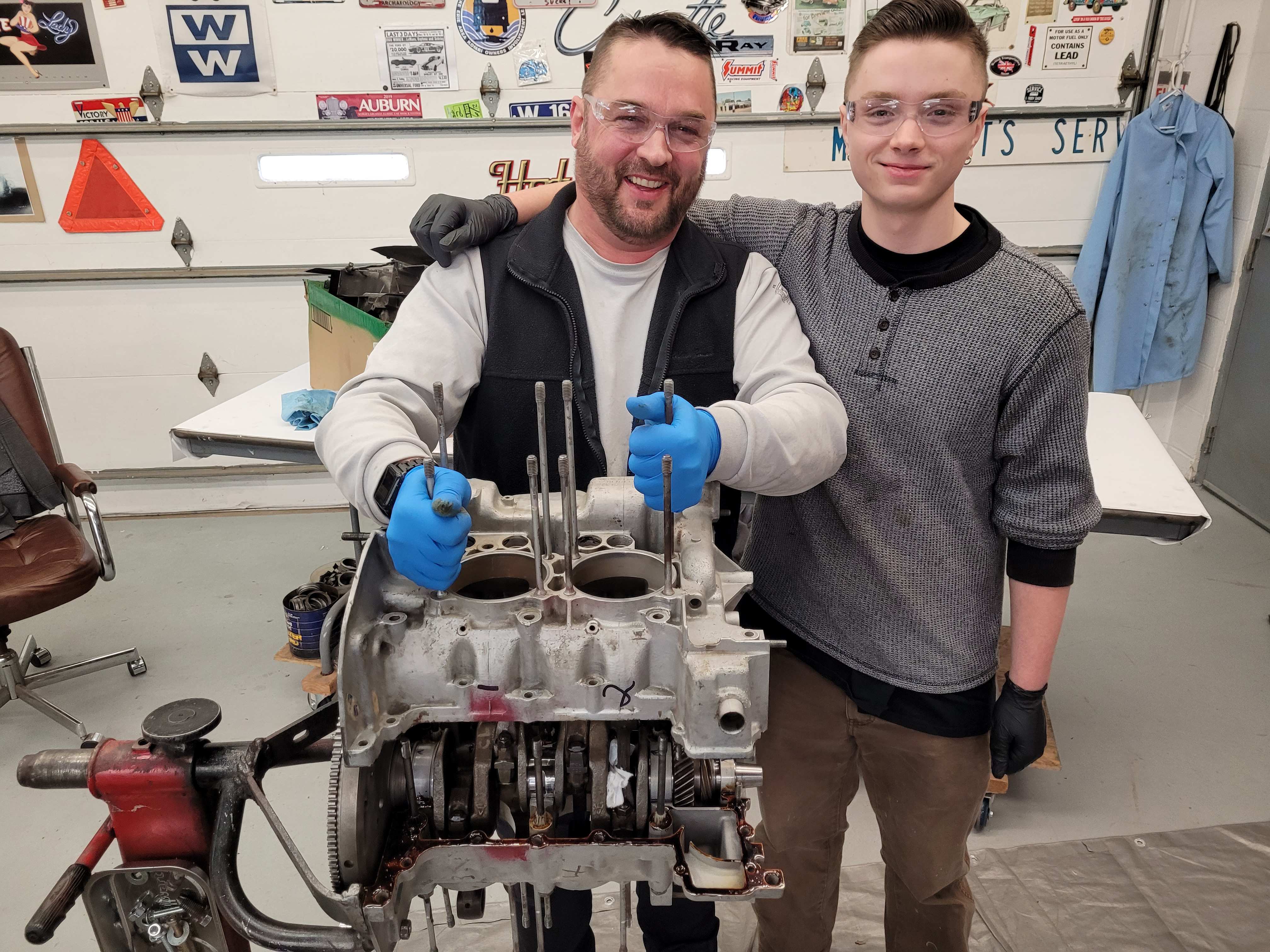 Anyway, we polished the crank and new cam journals, new hydraulic lifters, soda blasted the pistons and ball honed the jugs, new cast rings, took the best parts from 2 or 3 engines, new AMC heads, and put it together. Lee's son Luke also got in on the process.