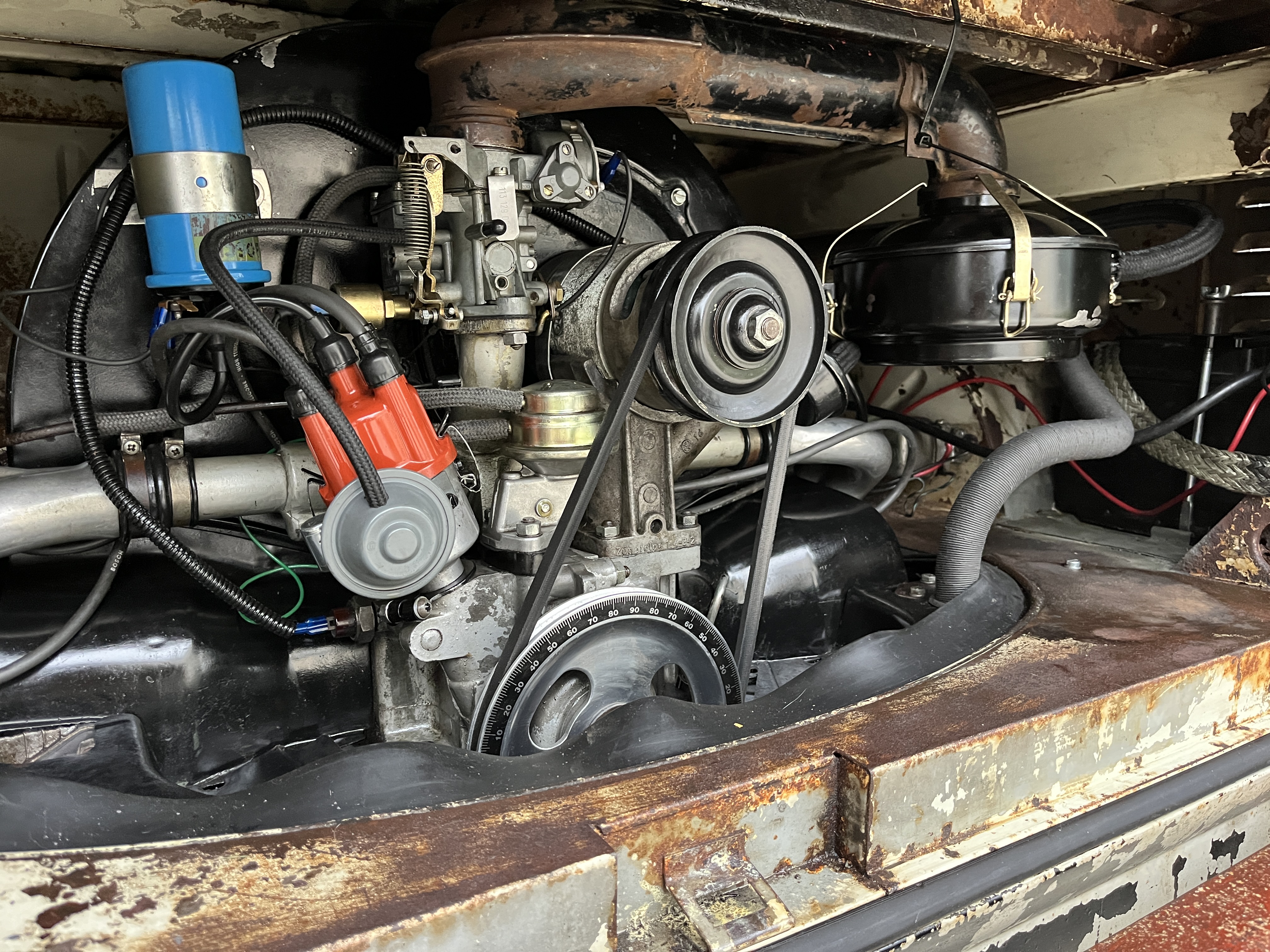 There is ZERO carb heat on this engine, a must-have for ACVWs. I've never seen a stock DP manifold without carb heat tubes. It has a cheesy aftermarket air cleaner which I don't like, too. I suggest a new intake with heat, and a stock 64-67 air cleaner with pre-heater tube for preheating the air. Lack of carb heat will cause stalling, hesitation, idle surging, carb ice, and unstable idle among other complaints.