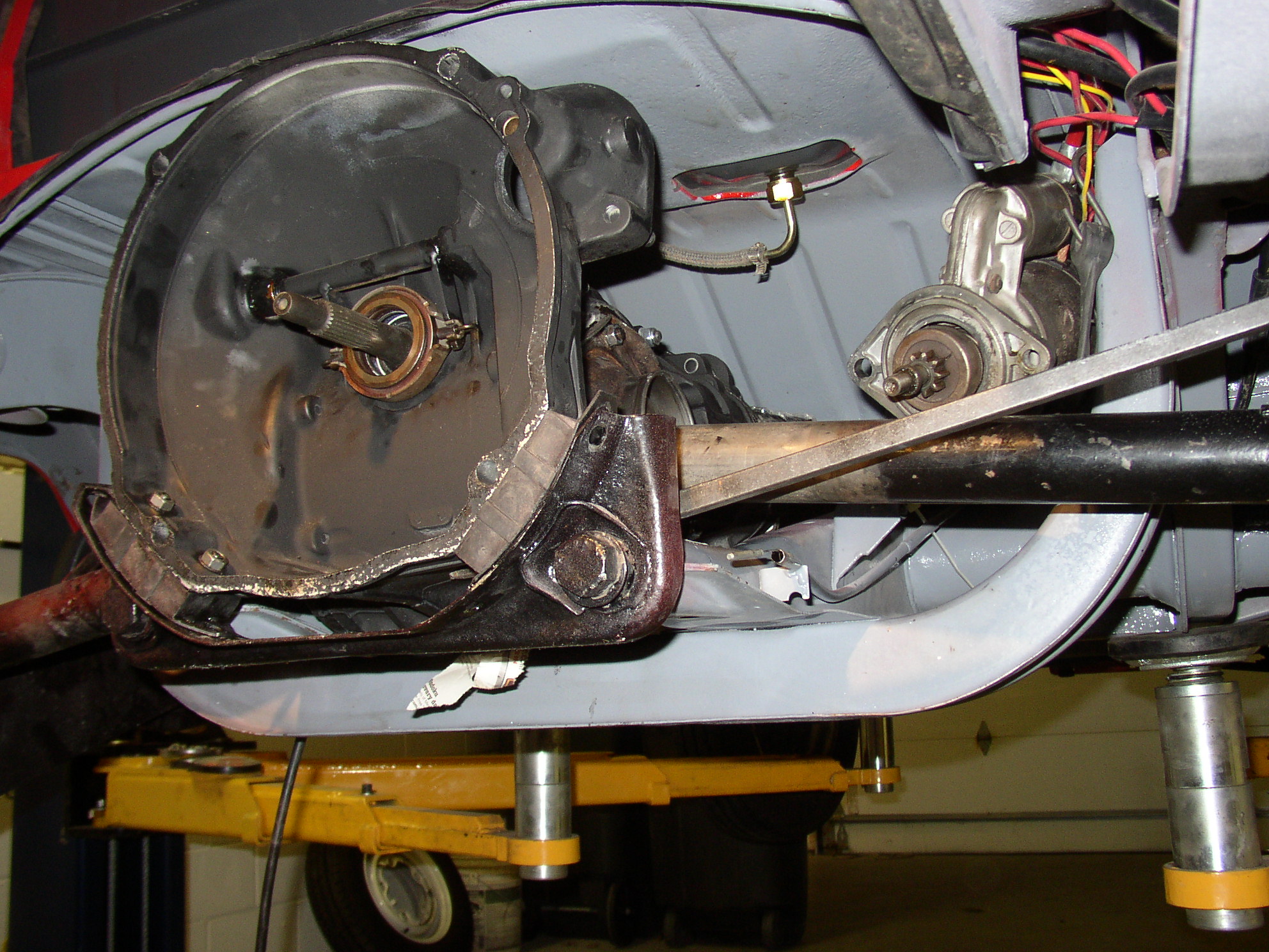 OK, the mounts, shifter, ground strap, and everything is disconnected, pop it loose with a prybar and it's just sitting there looking stupid right now.