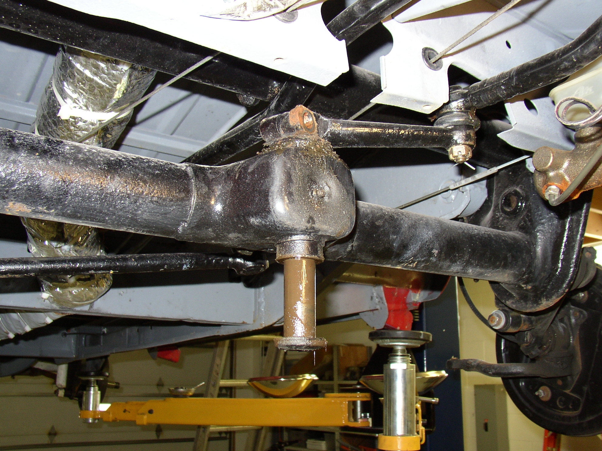 I "cheated" when I did the resto- the front end checked out as tight, so I cleaned it, painted it and figured I'd address any problems later. Well, later is here, and 3k miles proved the center pin to have a slight bit of slop in it along with one slightly sloppy tie rod end. Well, it's time to do the center pin. The Samba gang has a huge thread on this so I'll just post the details.