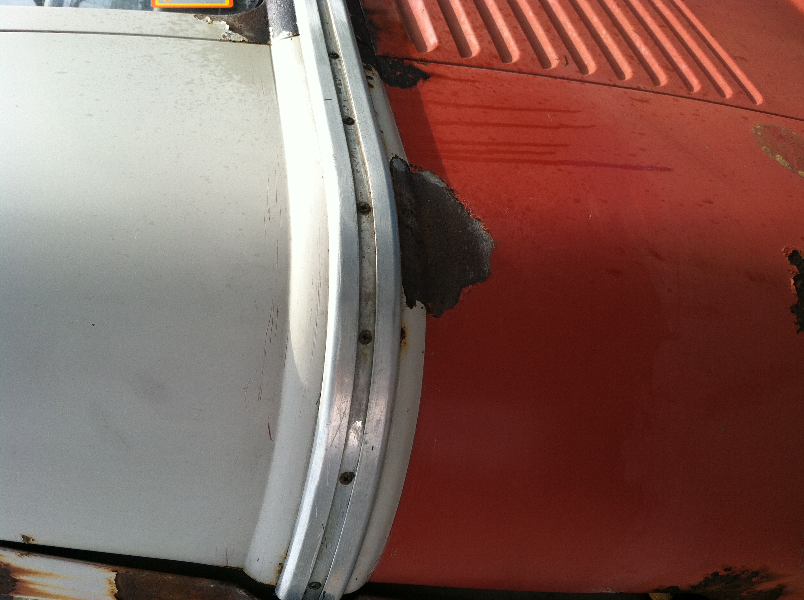 I have been working all week, but i was able to start removing some paint. Some idiot before me guessing in the seventies painted the chrome molding and the 'bump out' around the molding with two coats of blue paint.