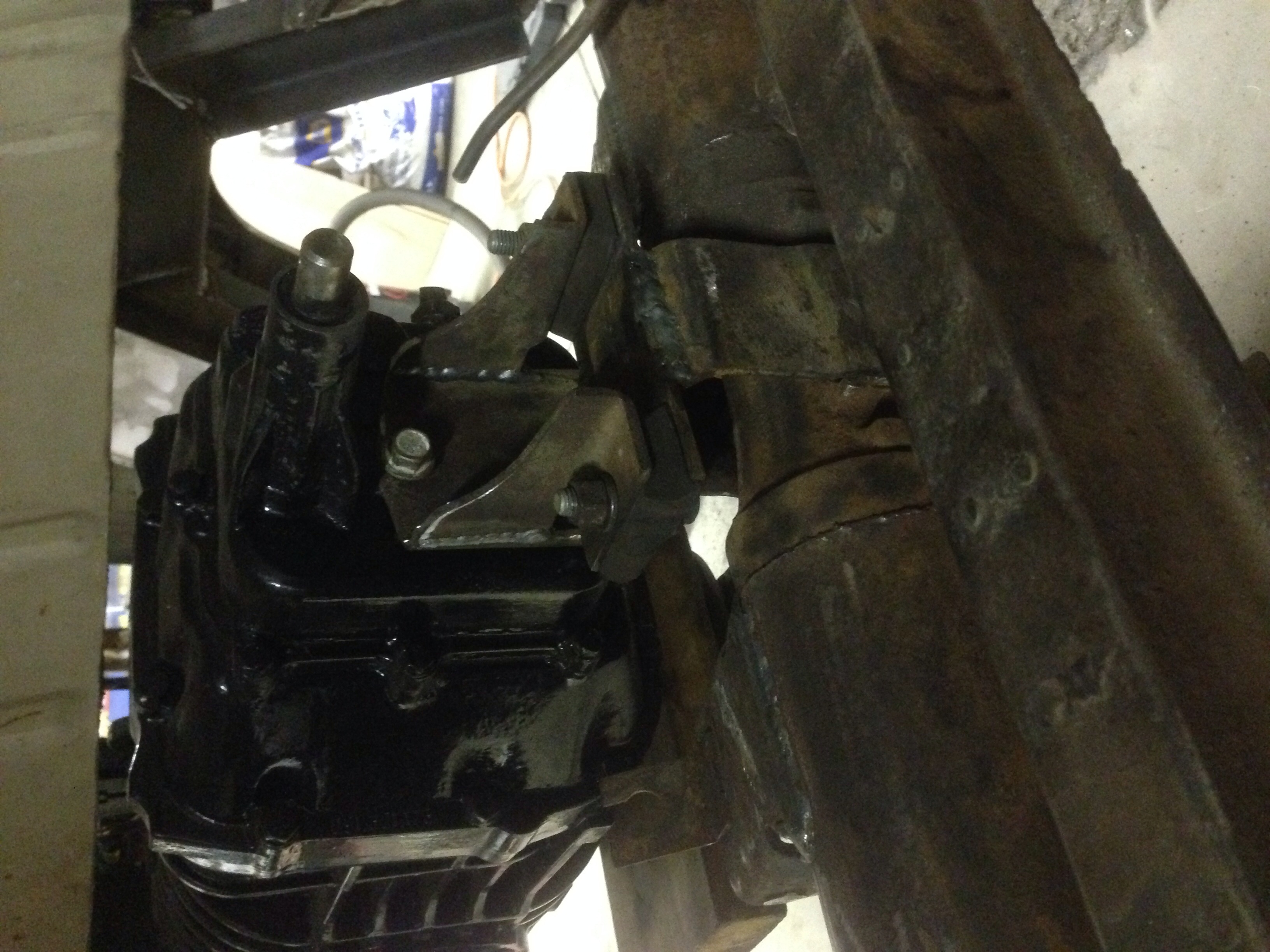 In order to be able to frame drag i had to raise the engine and transmission up 5" from their stock location. So i used the stock transaxle mounting bracket and cut it up and modified it. Basically i flipped it so that it mounts on top of the torsion tube instead of below the tube. It took alot of measuring to figure it all out, but the transaxle now sits 5" higher then it once did.