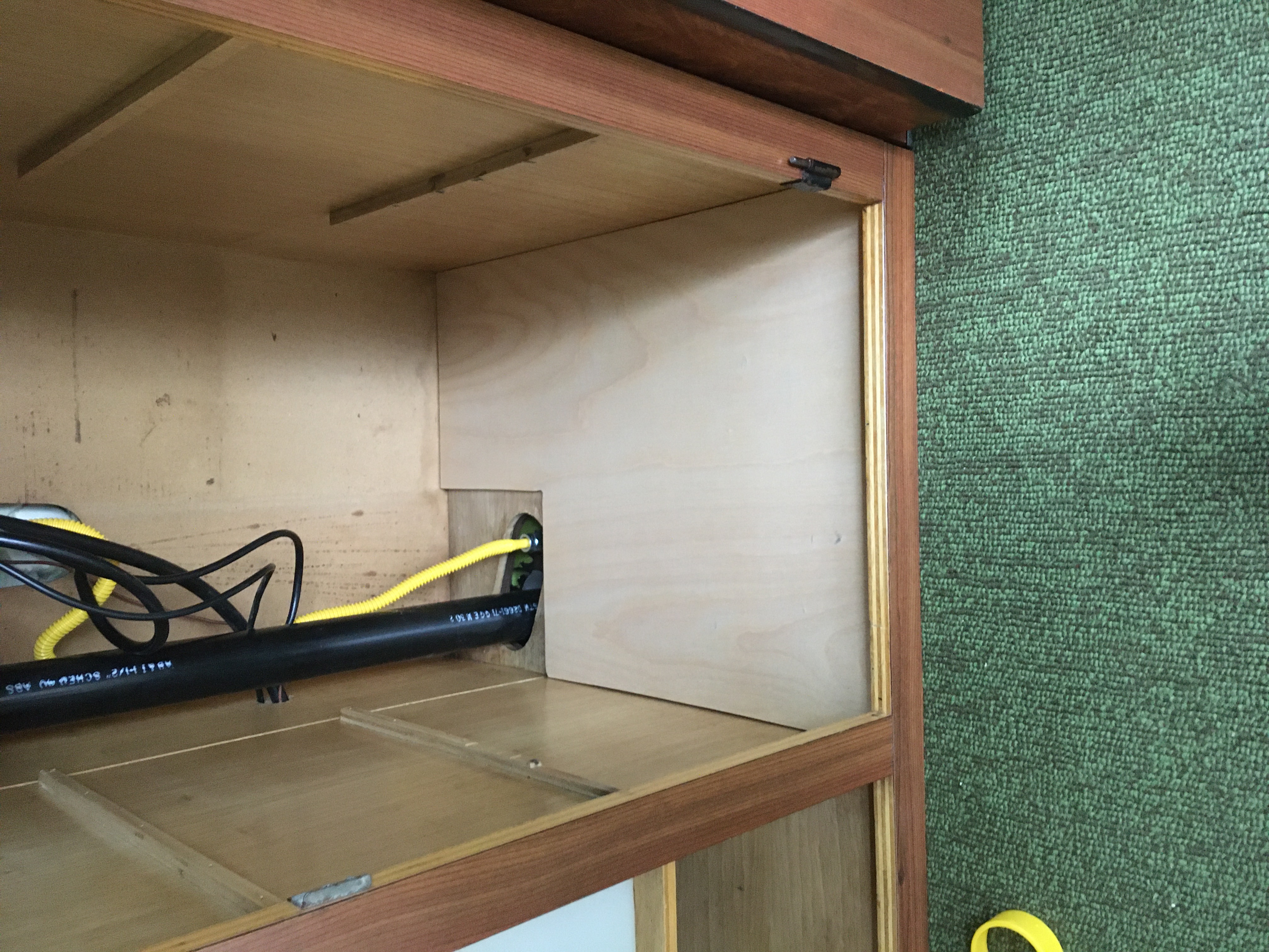 Put the main cabinet back in and replaced the main gas line while I had it out. Was able to get it at Home Depot. The original had 3/8 connectors as was 48” long. Most everyone else only had the 1/2 connectors. Resealed with the yellow Teflon tape and checked for leaks. No bubbles! Also cleaned and varnished the inside of the cabinets. Made a new shelf, one of the ordinal was pretty stained and beat up and made a new very thin bottom panel to cover the stains. I did RE varnish the entire inside including Masonite panel front and back. Also sanded varnished the underneath of the cabinet, no pictures of that. All this should give it some resistance to water.