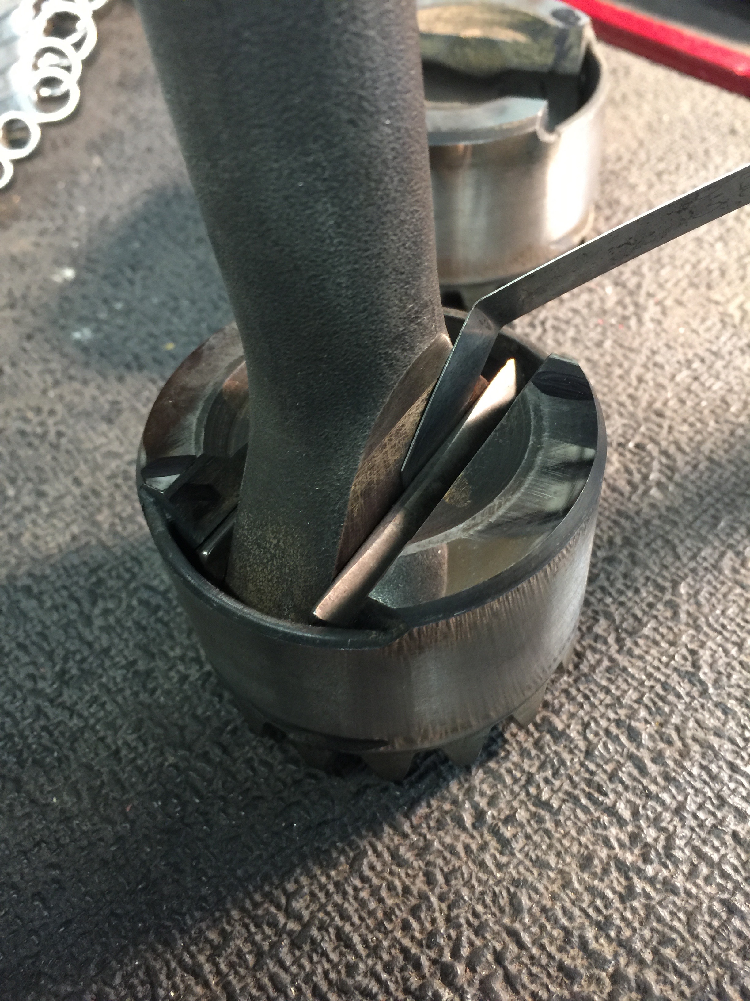 If you do this, you'll learn about wear marks on the axle paddles and the fulcrum plates. Bruce swapped mine around to get a better surface. He taught me how to make sure the axle and fulcrum plates don't disengage when you're putting it together. You'll learn how to get the one piece (aren't they all one piece?) axle boots without the separation and screws onto the axle tubes using a little heat and persuasion. You'll also learn about the spacer and c-clip that goes "inside" the tranny hole (left and right) and then the plastic "hat" that goes over the opening before the axle tube goes on. You'll learn about the virtues of RTV silicone when mounting the axle tube to the transmission housing. On the other end you'll learn there are inner and outer axle bearings as well as inner and outer stub bearings. And the inner stub bearing has an internal nut that has to be torqued to 108 ft. lbs. and has a raised edge that has to be pinched. More c-clips will follow and the outer housing of the RGB case can be installed following the two dowel pins as a guide.