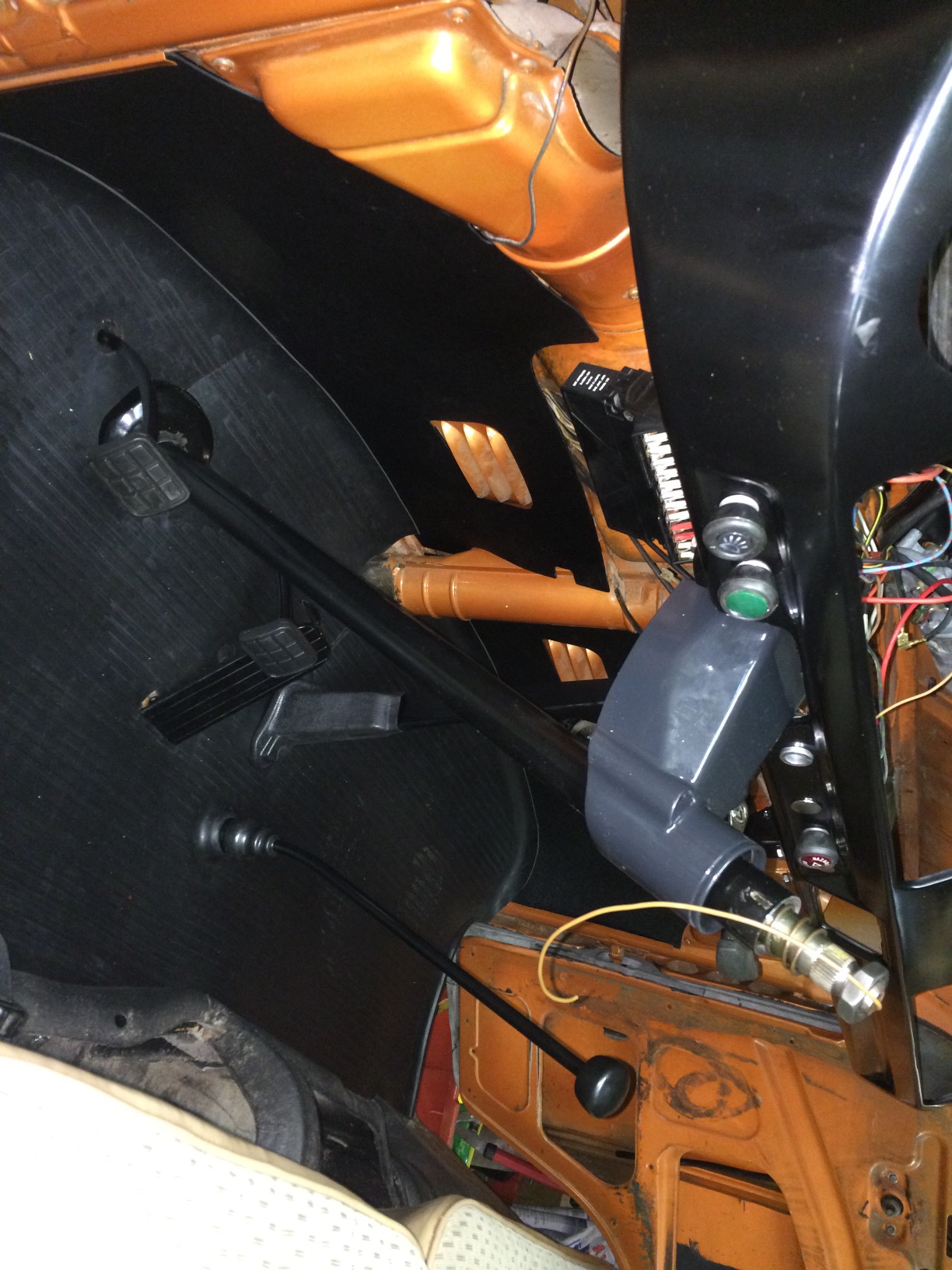 Replaced the steering coupler last night so I could mount the steering column and ignition housing. Ran new wire for the horn which had been missing. Finished hooking up the emergency brake and put in the new floor mat. Still a lot of wiring to do. Ignition, emergency flasher, turn signals (not hooked up in photo) and headlights all work. Cannot get the taillight or brake lights to work yet.