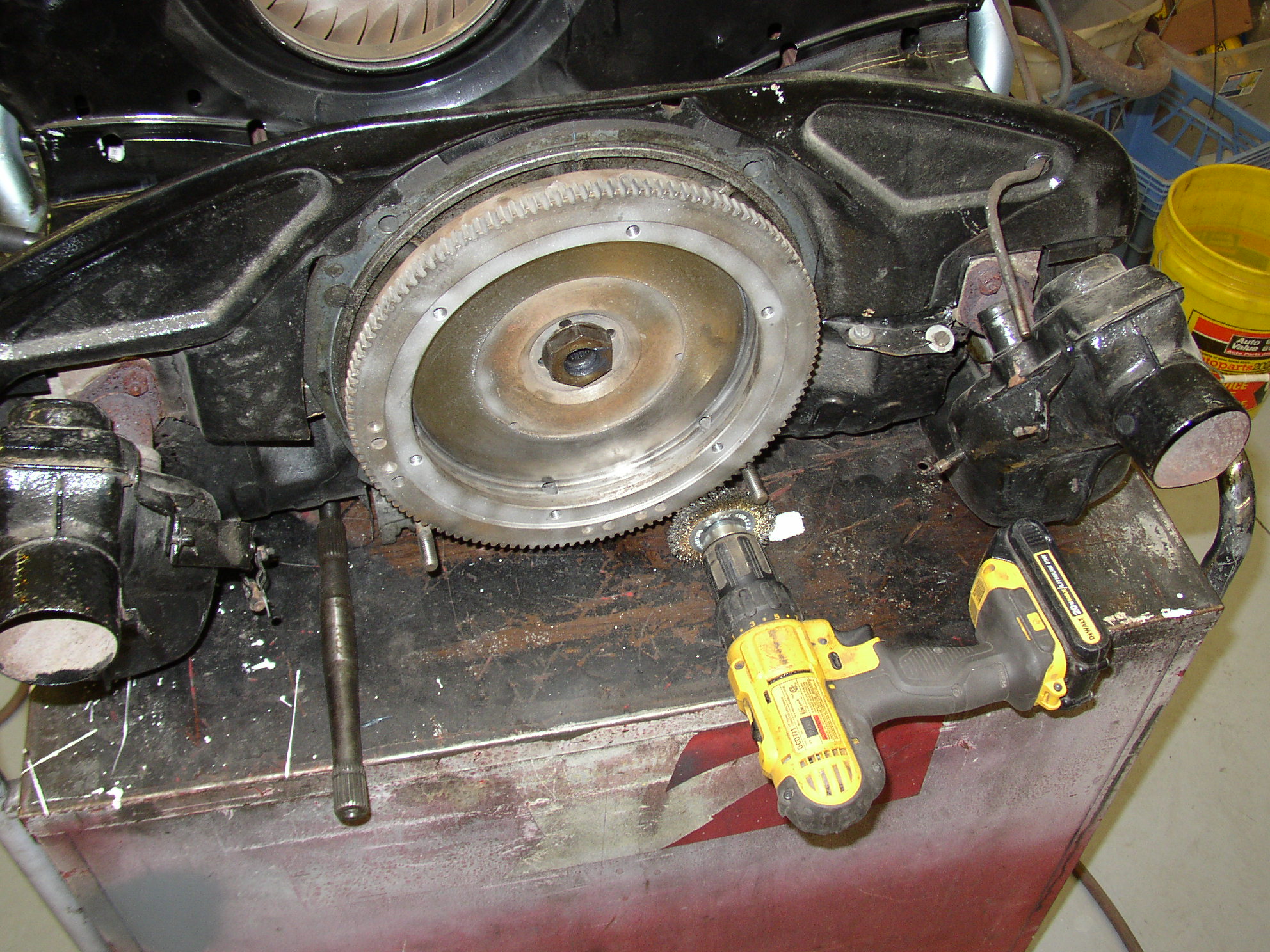 Here we're putting the bigger gen stand on, brand new 12v gen from Mick, replacing the flywheel, torqueing it. The flywheel was a used 12v so I blasted it and DA'd the friction surface with 120 grit. I checked end play before and after, it was the same.