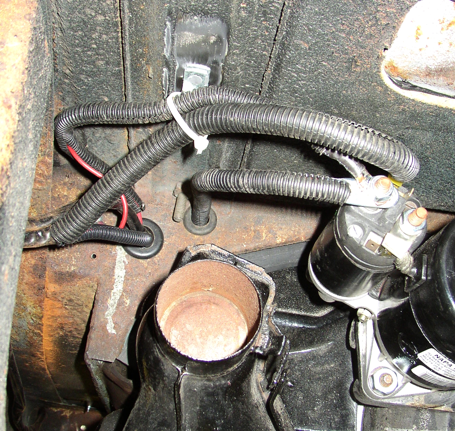 Here's the starter area detailed with Polyloom to protect the wiring. I've been epoxying a wire clamp to the tray so I have a place to put a ty-wrap, I don't like the harness laying on the heater box which is what happens after it warms up. You can't use a sheetmetal screw here as the fuel tank is just above it, ask me how I know that.