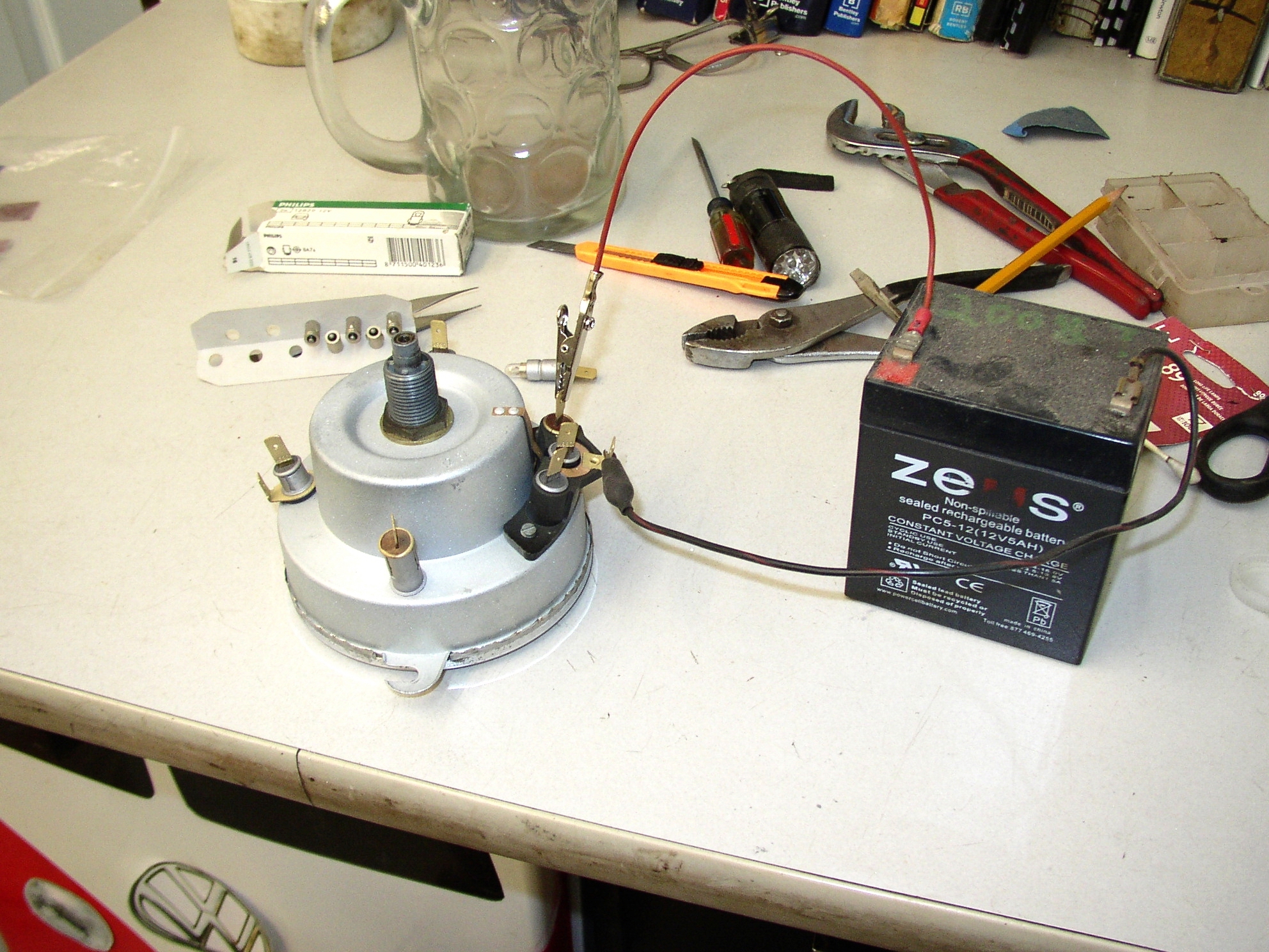 Upgrading to 12v either means you run 12v through a 6v starter or put a 12v flywheel on. Ken's 6v flywheel teeth were kind of beat up so that made the decision easier to go to a 12v flywheel which is larger by 1/8". You've seen me use this homemade "tool" before: