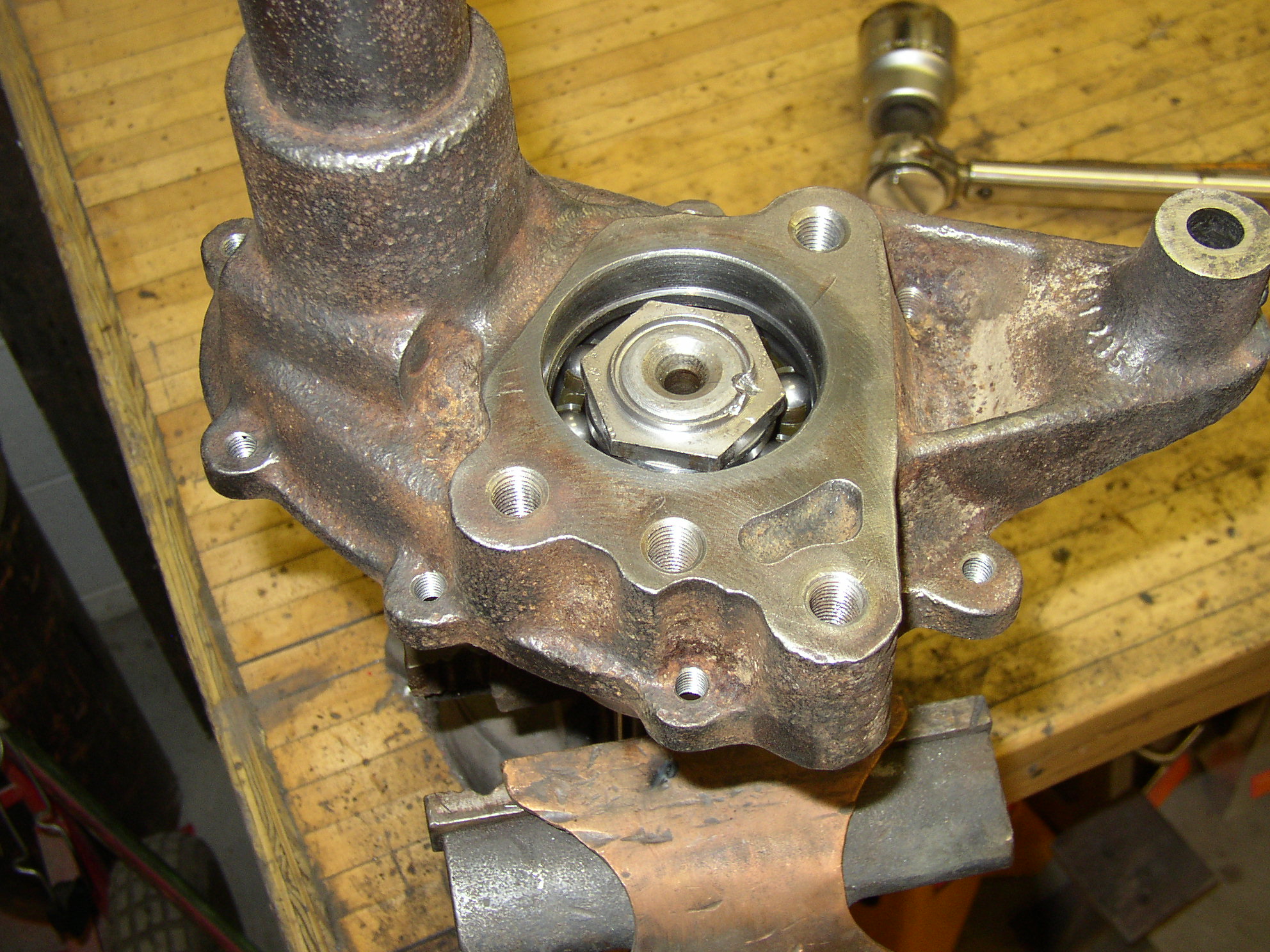 That's a hole in the side cover. Wow, what a F'ing mess. That's goop all over the ring gear and in the bottom of the case. The side bearings are seized and the input shaft won't turn. The tires came (Hankook RA18's from WalMart, $77/ea) and the wheels are ready. While the tranny's out I'm going to reset my spring plates. I can tell it will have too much camber by just rolling it around. I looked up my pics on the '66 and it's virtually exactly the same number- set to the service manual. I need to drop it back about 3 degrees.