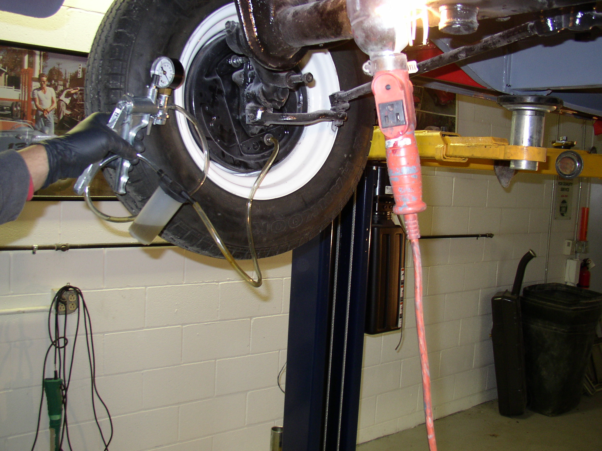 I usually use a vacuum bleeder setup, but the '67 has check valves in the fluid outlets that have a crack point higher than atmospheric so it won't work. Here's a shot from a few years ago so you know what I'm talking about. I just did the pump-the-pedal thing by myself and it worked fine, maybe even easier than vacuum bleeding. Another tip is to lock all of the drums tight with the adjusters before bleeding. When you go to check your "pedal" this eliminates any slop from your not-broken-in-yet shoes. When you check your pedal and the air is gone, it will be rock hard. When you're done, back off the adjusters a few clicks and go for a ride.