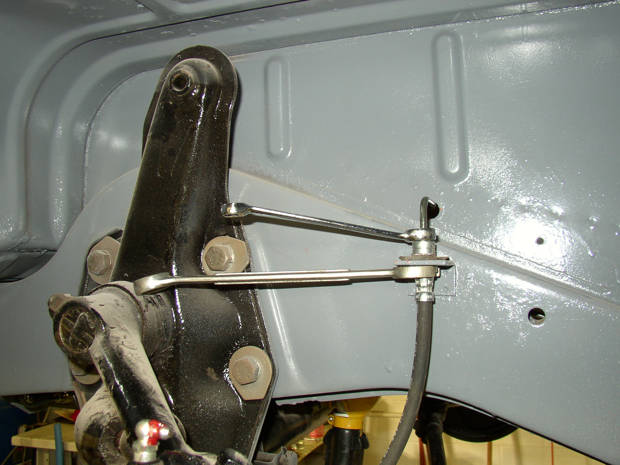 connect the hose to it.. ..... Then tighten it down. It's much harder to start the fitting when it's already in the bracket. This is another place where the 'spensive wrenches pay off- good line wrenches don't flex like cheapie line wrenches. Don't forget the rubber grommets and horseshoe clips.