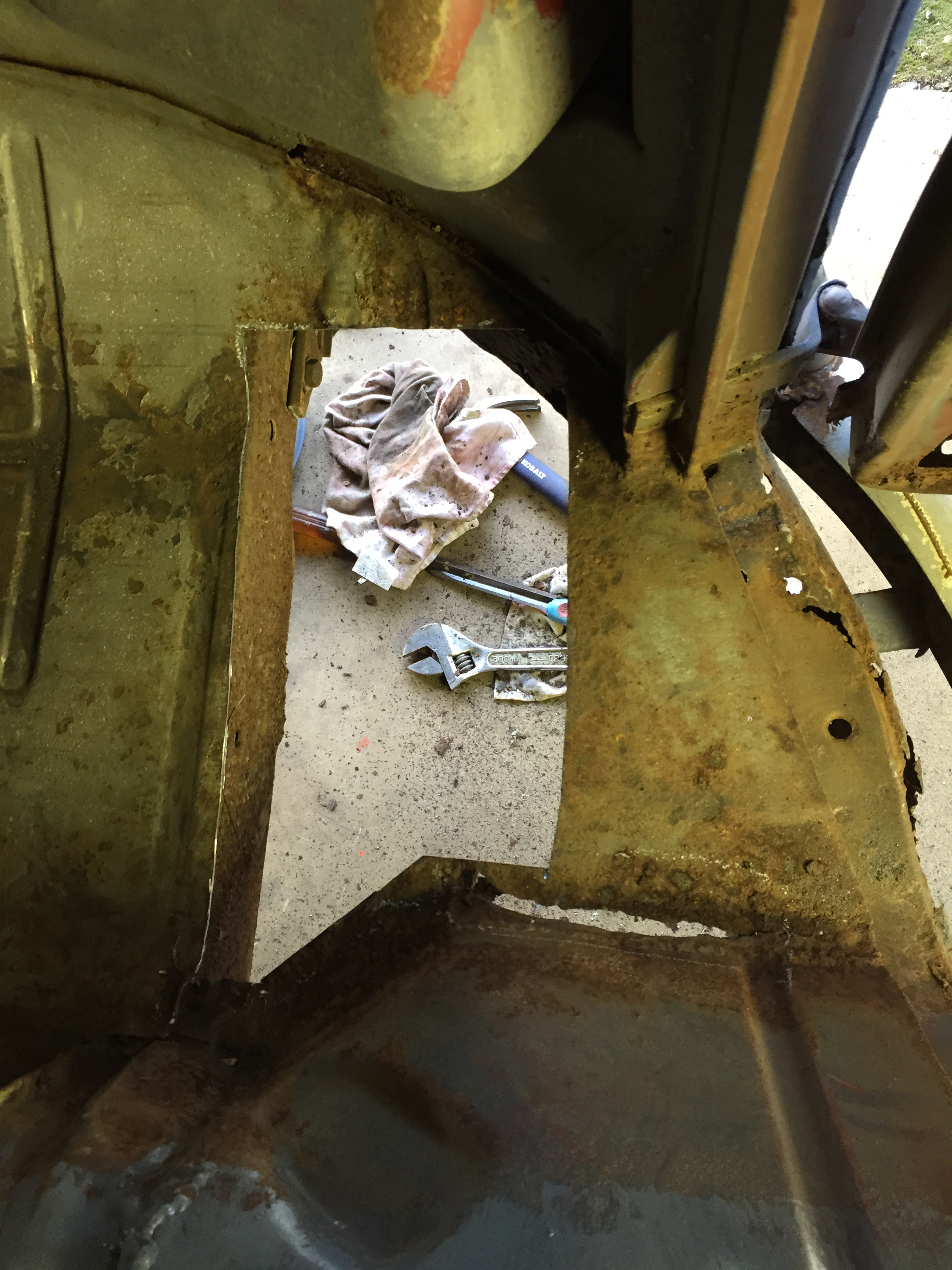 finished welding in driverside floor pan .....n paint ....home made repair panel ....