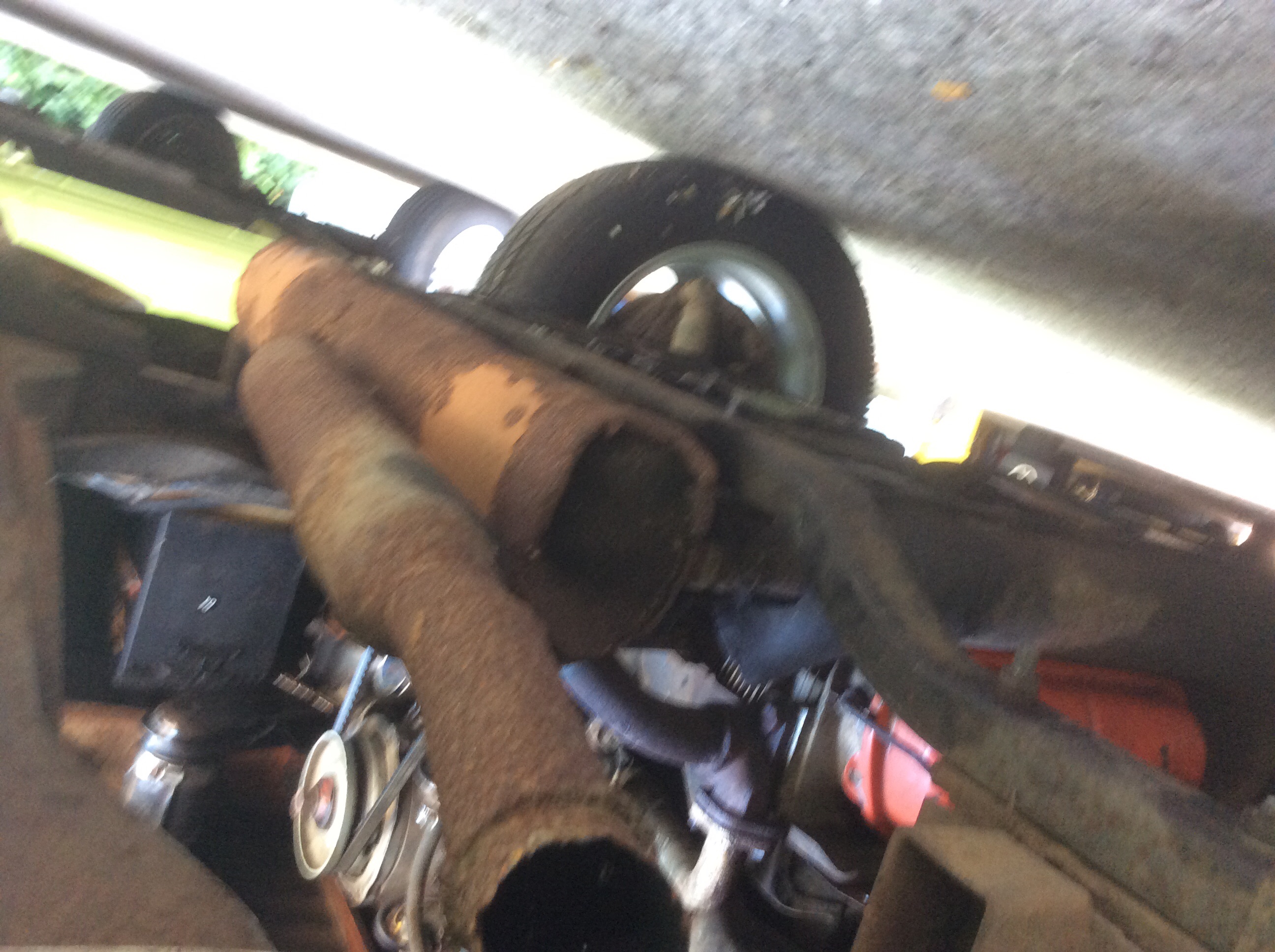 First project is to replace the exhaust. I've never seen an exhaust like this and thought maybe it was some special Central American VW Part. When I saw that it was welded to the heater boxes it was clear that this was no factory exhaust. Appears to be cobbled together from several mufflers including parts of an actual VW one. I am going to replace it with a stock exhaust and J-tubes until I can locate some good heater boxes. Not planning to drive this during the winter anyway.