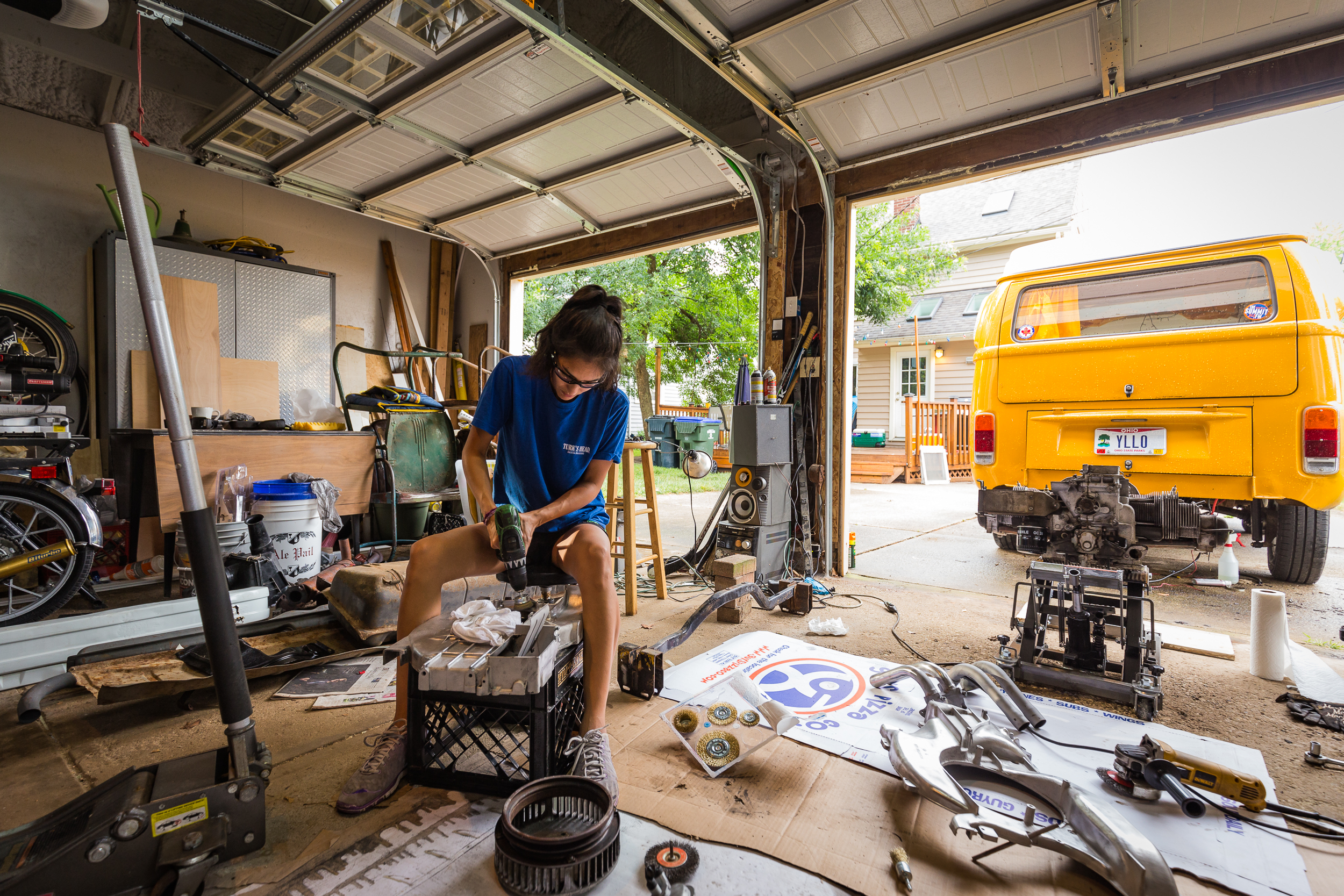 On our trip to Vermont last fall we started having issues. When we finally limped it back home, we knew it was time to start making the necessary repairs. I created another post over on the Samba for some help with the problems I was having, and that's where somebody recommended I get in touch with this guy "Chuck from LOAKOIL." I gave him a call and he came down a few days later to take a look. Turns out I'm missing a bunch of parts thanks to the previous owner removing the fuel injection in favor of a carb, and then a TX shop cobbling a FI kit together to re-install it, without all of the original pieces. But it got us home from Austin. I guess that's what happens when you buy somebody else's project. Chuck said "get that engine pulled and we'll start making it right" so that's what I did. After a couple trips down to Akron to bring me parts and knowledge, Chuck noticed that the keyway on the crankshaft was all blown out and put back together with Loctite, so I packed up all of my freshly sandblasted and painted parts and took them up to his shop. The gas-tank has now been cleaned out and reinstalled, with a new fuel-filler neck and rubber hose. We re-cushioned and re-upholstered the front seats, and cleaned up and greased the swivel base on the passenger seat. Here are some recent photos: