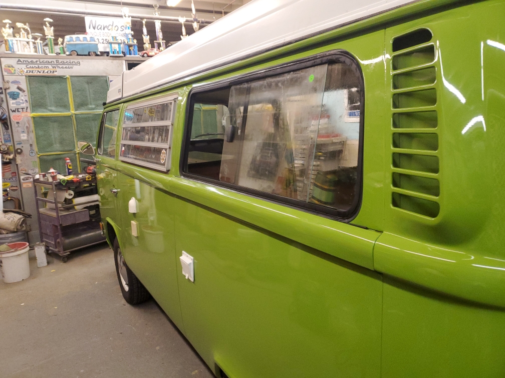 Finally got around to putting in new sliding rear windows. Rather had new windows put in. I was afraid there was some rust in the channels so found a body shop through the Cincinnati VW Club that was up to the task. I took out the rear cabinetry and took it over. Turns out there was rust in the left side rear and rear hatch. Right side was okay.