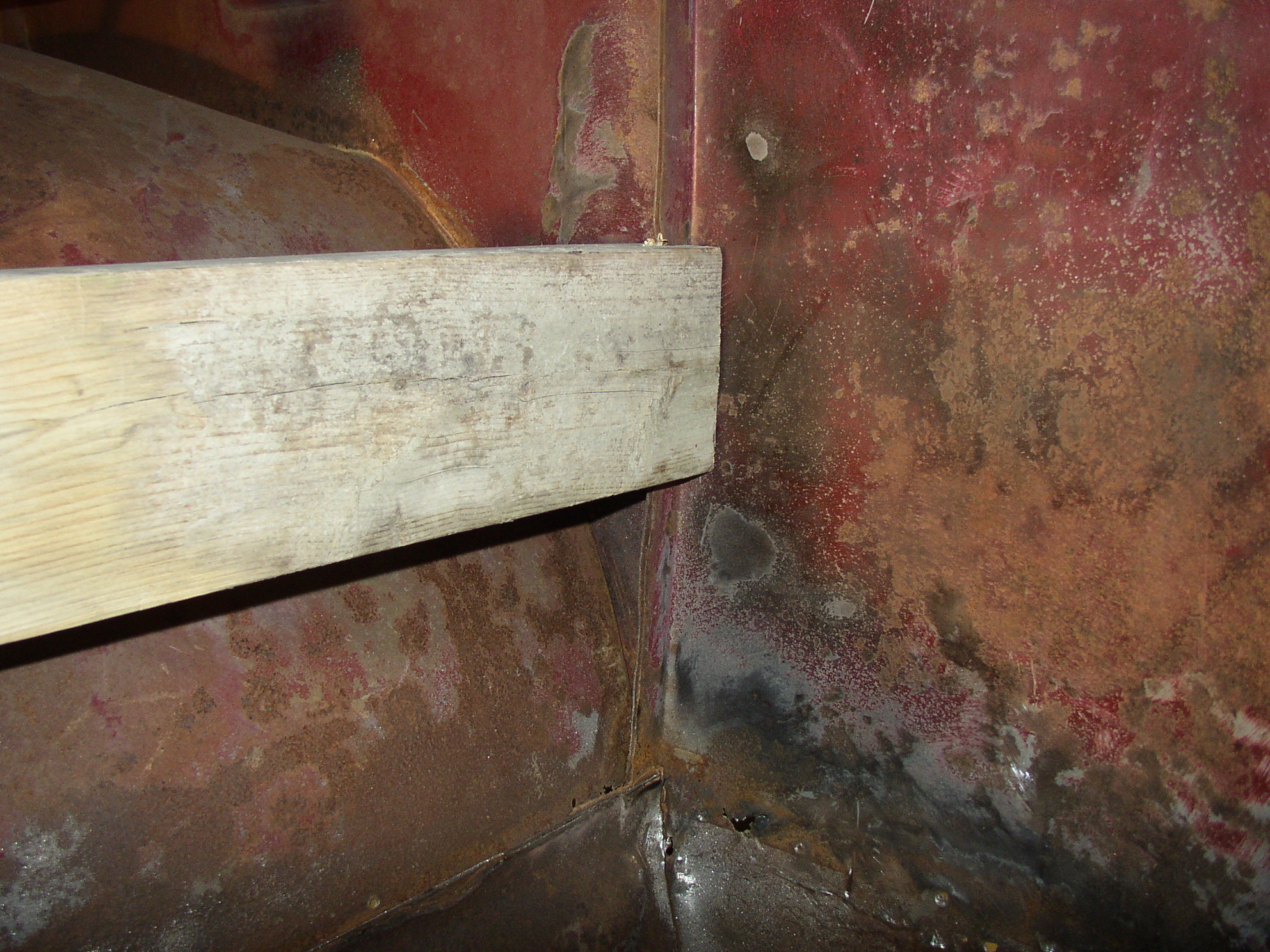 Onto the right rear corner. I still needed to push out some previous body damage, so a 2x4 with a slot cut in the end worked well for pushing right on the seam where the metal was pushed in.