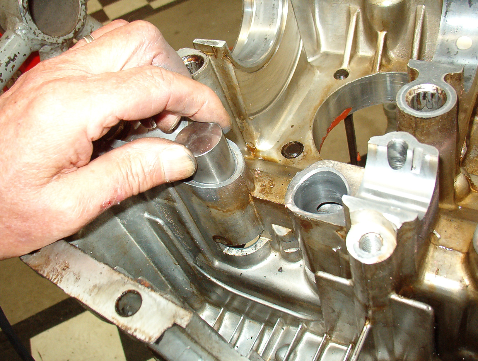 First step was to replace the pilot bearing which lives in the end of the crankshaft on T4 engines ( in the flywheel on Porsche 914's) and in the gland nut on type 1's. This bearing supports the transmission main shaft. If this bearing fails( it happens) The transmission main shaft and the engine become one,like a Chinese finger, whatever gear you are in at the time of failure is where you are stuck until you pull the motor (with a degree of difficulty do to the trans mainshaft being stuck in the crank) and replace it. Pack it with grease just as you would for a wheel bearing. install Next we mount the crank on the holding fixture for cleaning. remember,this crank has been in 2 machine shops,welded on ground on drilled and polished. So,we need to make sure that the oil passages are clean and free of any obstructions. A gun cleaning bore snake is great for this. Next,clean the oil passages in the case. Again,gun cleaning brushes work well along with blowing them out with air.