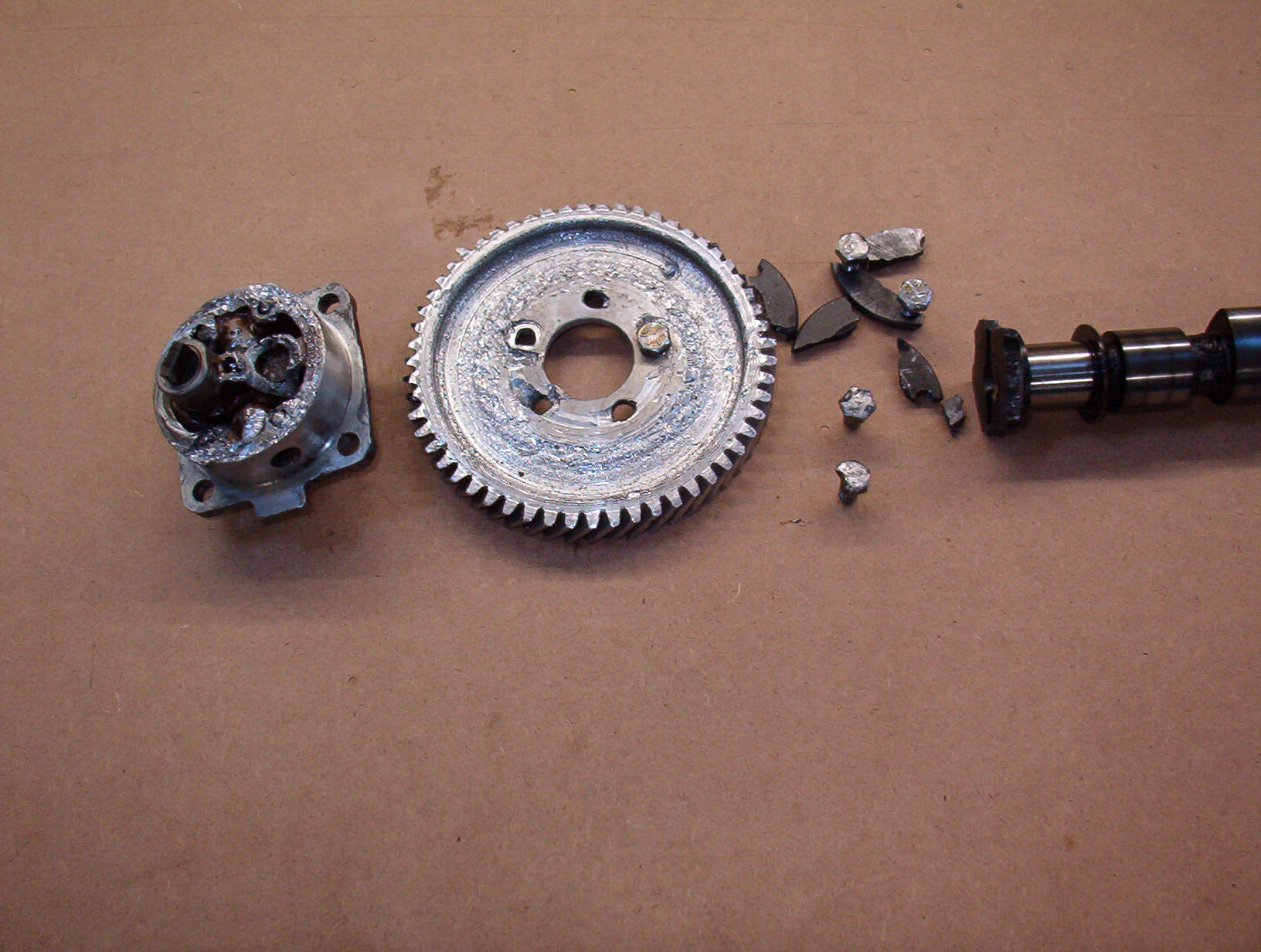 Just a note here. ALL replacement cams come with bolt on gears. Most all replacement oil pumps will have clearance issues with the cam bolts and the pump. Note the low profile heads on the cam bolts. If you do not check this clearance,THIS WILL HAPPEN.