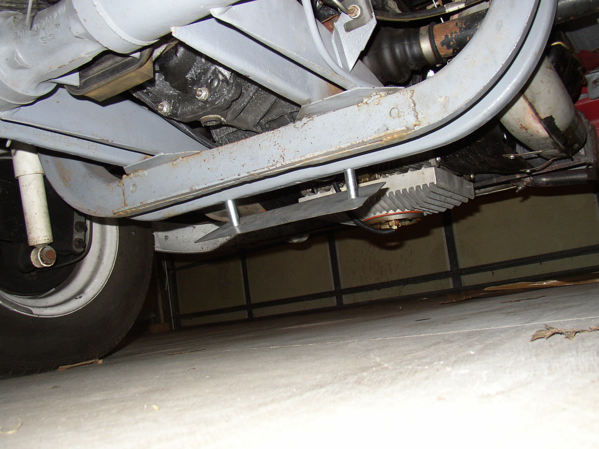 To increase cooling I resorted to hillbilly ingenuity: I mounted a piece of .033" steel (heavy sheetmetal) on the tranny crossmember with some shock spacers, this will obviously get airflow all around the sump. You can see the temp sender in the bottom sump plate.