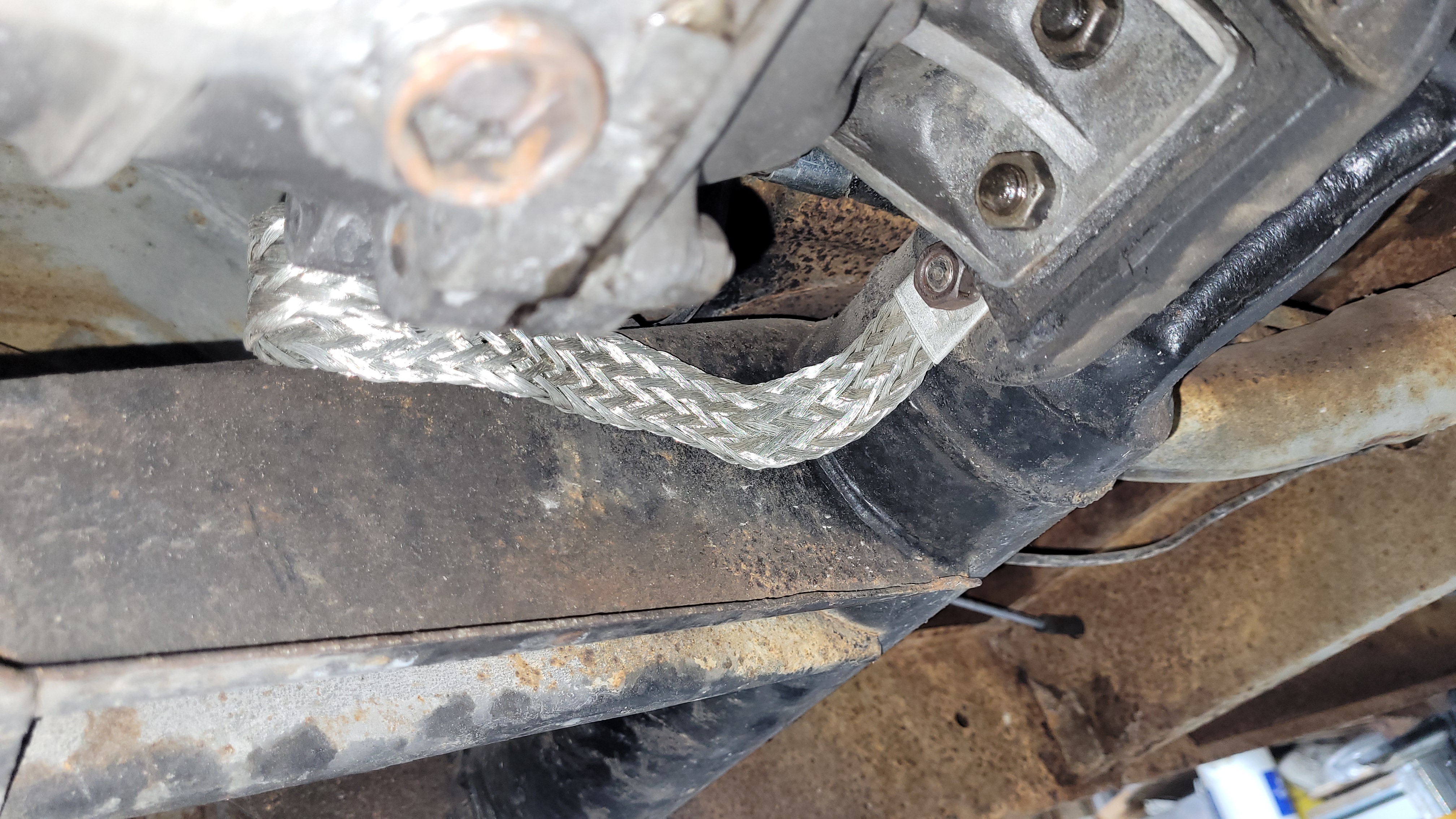 Ground strap was missing completely on the trans so I installed one. Battery hold down was missing so I installed one. I consider this a safety item- if you go in a ditch and your battery shakes loose, it will short out and burn the bus down. I cleaned the grody ground strap on the battery, too, but didn't take pictures.