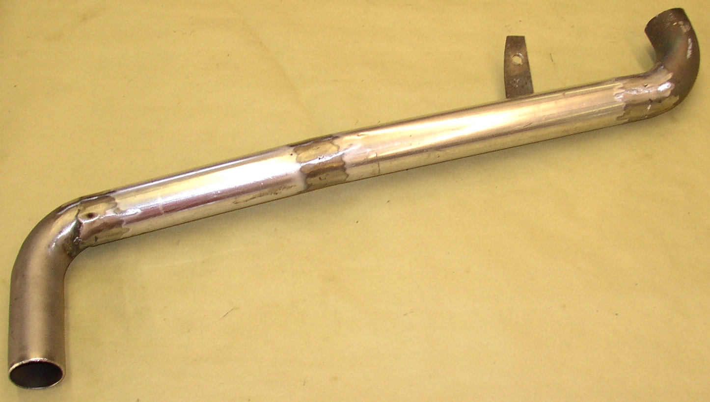 The rear bumper has been a little crooked for years so I figured I'd correct that before making a tailpipe. I tried bending the bracket in a vise to no avail so I bolted it on and used a long piece of water pipe to bend the bracket to fit. It's nice and straight now. Back to my hillbilly exhaust- a stock Bug muffler has a pair of 1.375" exhaust outlets but a bus muffler has only one 1.25" outlet, with a 1" core in the tailpipe resonator. Wow, talk about restriction! I cut the 1.25" spigot off and welded on a 1.5" outlet and fabbed up a 1.5" tailpipe. I formed the spigot to use the stock style clamp assembly where the tailpipe attaches. You can see the paint I used was not high temp.
