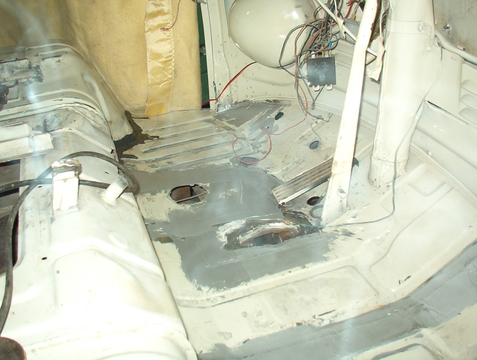 After we striped out all of the interior and Dennis started sanding we found lots of holes,including what looked like a complete replacement floor panel that had been cut up and used to patch the cab floor,which should have been replaced as a complete floor.