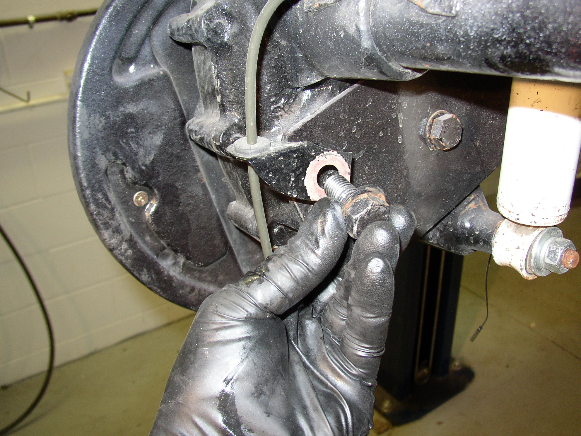 Simply pull the backing plate over the axle stub and hook it up with a bungee hook on the torsion tube.