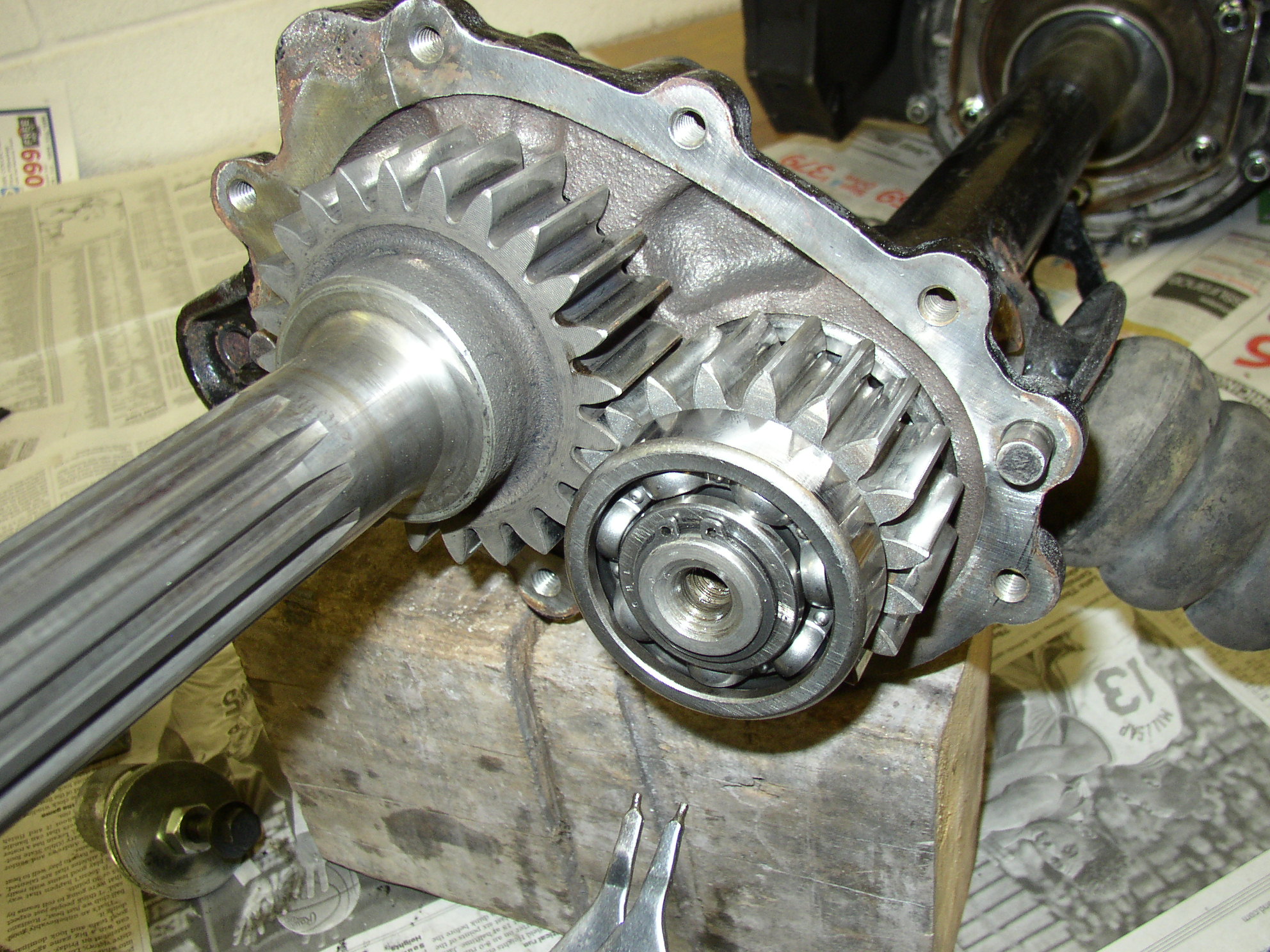 OK, tranny’s out, time to swap the axles onto the new trans from Rancho. First, set it up where you can work on it, I use a cart and a block of wood to raise the hub. I used the Bentley as a guide to do this so it’s pretty straight forward but I don’t have the 5 grand worth of specialty tools that it calls for.